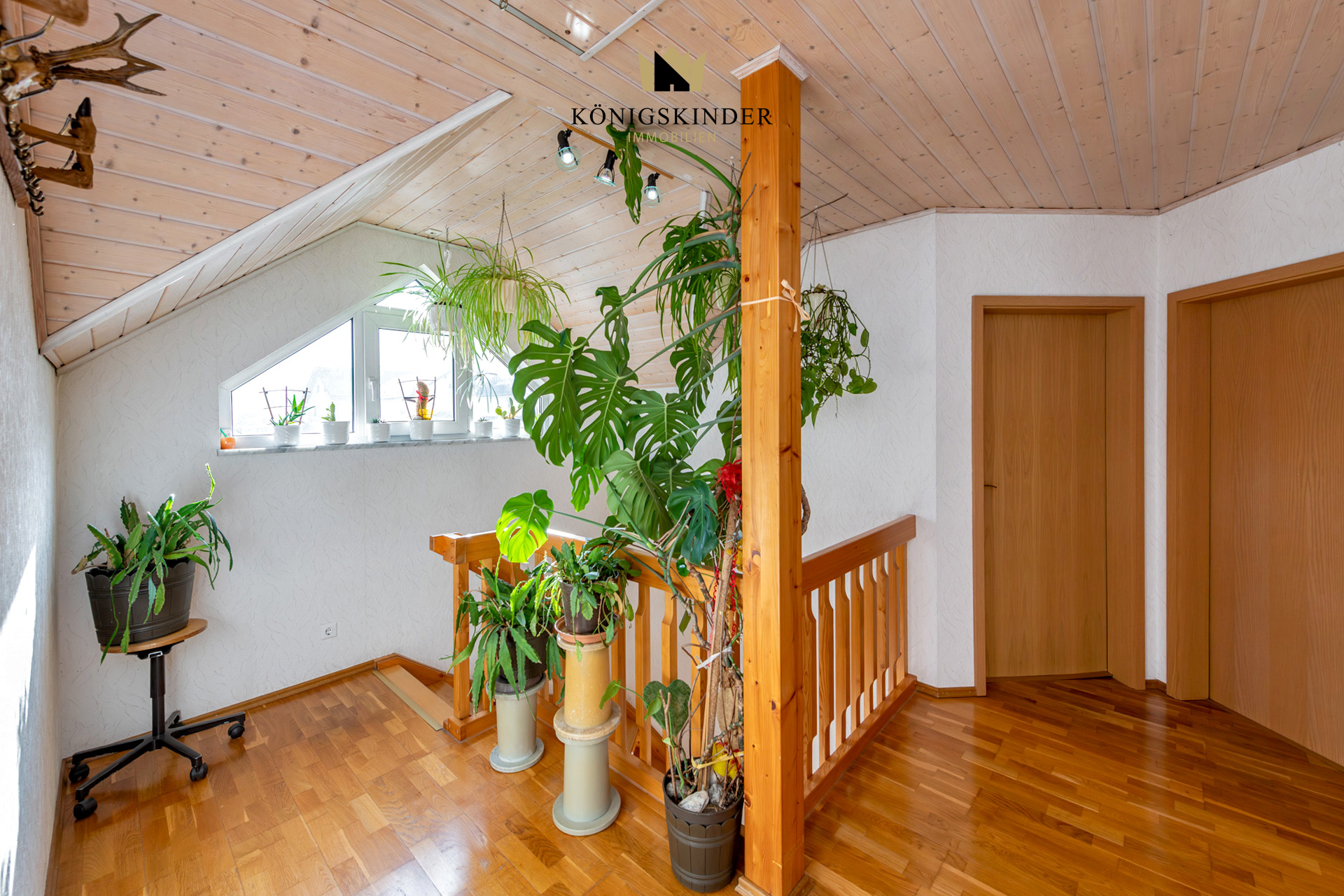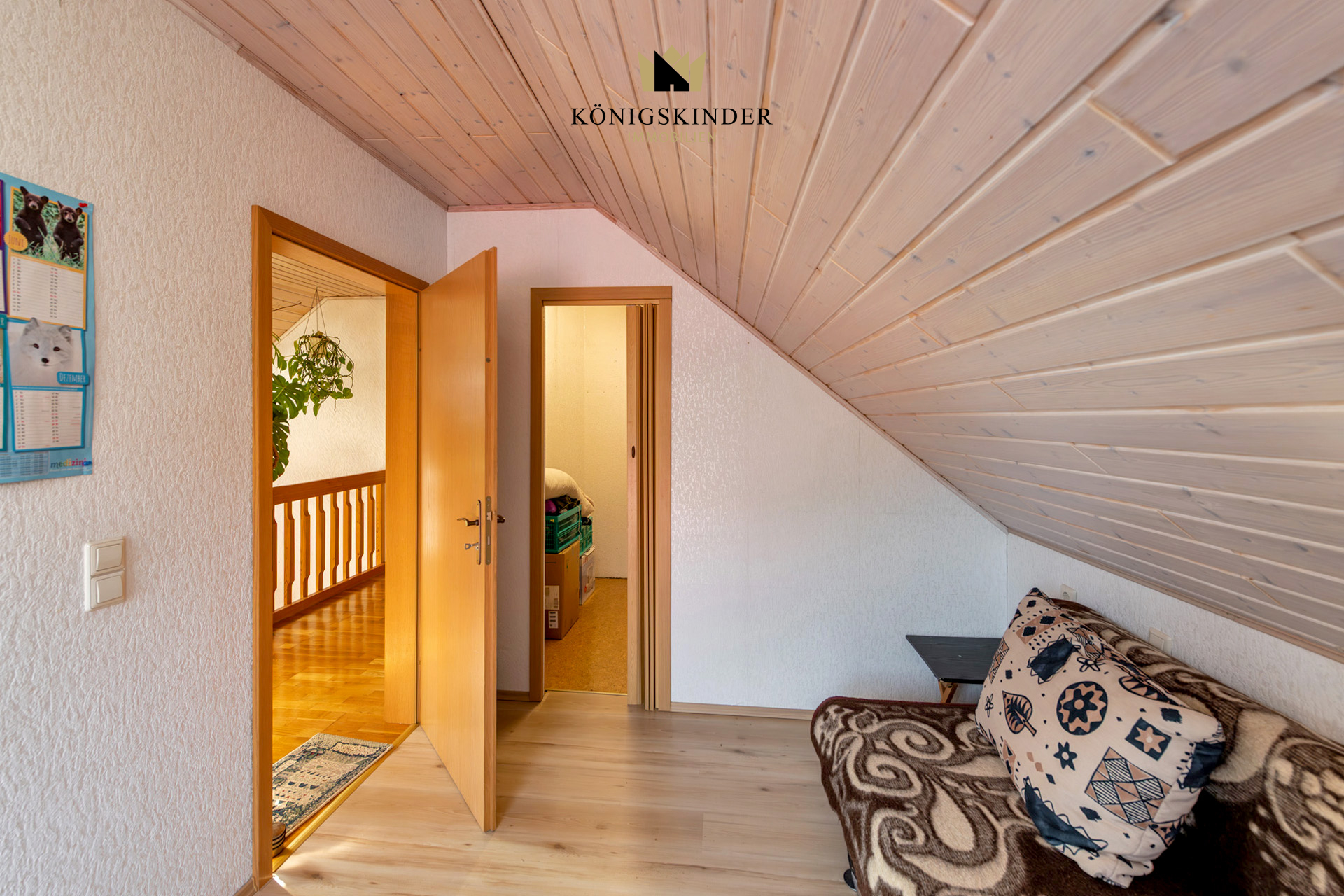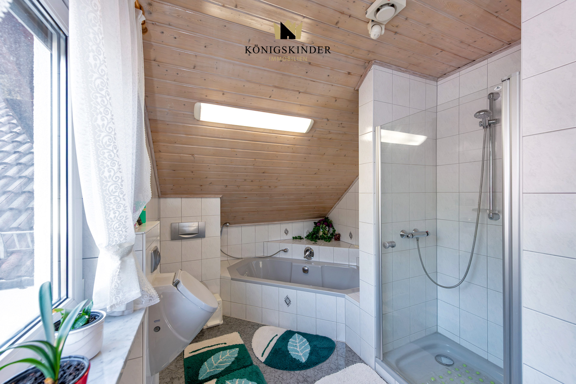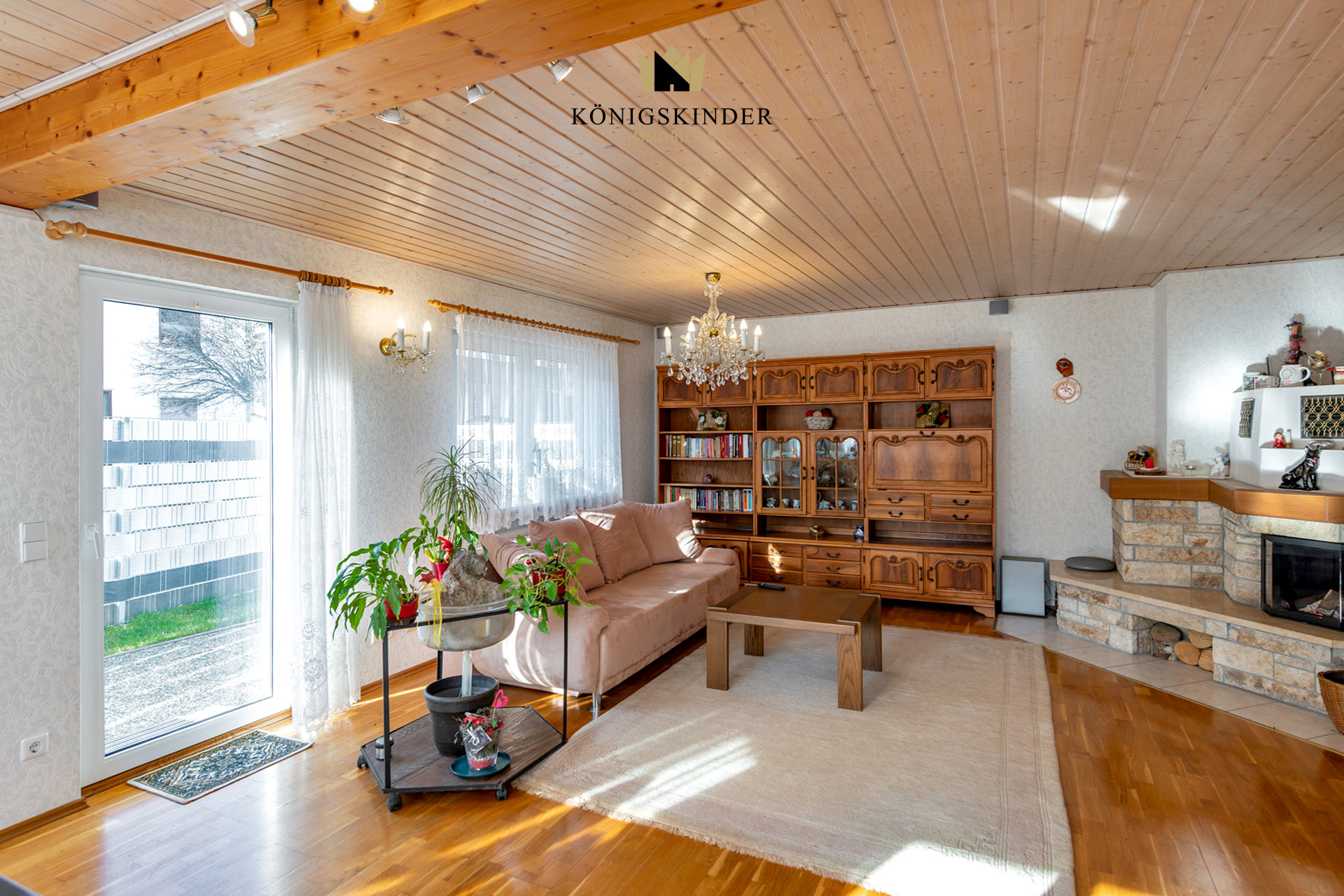 Barrierearmes Einfamilienhaus mit Einliegerwohnung, Garage & moderner Energietechnik – Wohnen mit Zukunft Willkommen in einem Zuhause, das Großzügigkeit, Flexibilität und nachhaltige Technik harmonisch vereint. Dieses attraktive Einfamilienhaus in HAAS-Fertigbauweise (Baujahr 1996) überzeugt durch seine durchdachte Raumaufteilung, barrierearme Elemente und eine separat nutzbare Einliegerwohnung – ideal für Mehrgenerationenwohnen, Homeoffice oder zusätzliche Mieteinnahmen. Bereits beim Betreten spürt man die angenehme Wohnatmosphäre. Der fantastische Wohn-Essbereich mit fast 40 m² bildet das Herzstück des Erdgeschosses. Große Fensterflächen schaffen eine helle, freundliche Umgebung und führen direkt auf die sonnige Terrasse – perfekt für entspannte Stunden im Freien. Ein echtes Highlight ist der ästhetische Kaminofen im Kachelofen-Stil mit gemütlicher Sitzbank. Der neue Einsatz sorgt für wohlige Wärme und ein stilvolles Ambiente. Die hochwertige Wohnküche der Marke NUKO bietet nicht nur viel Platz zum Kochen und Genießen, sondern auch einen direkten Zugang zum Balkon. Ergänzt wird das Erdgeschoss durch: ein modern ausgestattetes Gäste-WC mit Waschtisch, Pissoir und WC sowie ein vielseitig nutzbares Zimmer als Büro, Gäste- oder Hobbyraum Im Obergeschoss erwarten Sie zwei helle Kinderzimmer, ein großzügiges Elternschlafzimmer mit separater Ankleide und Split-Klimaanlage und eine geräumige Diele. Das 2022 erneuerte Tageslichtbad begeistert mit Eckbadewanne, Dusche, Pissoir, WC und Waschtisch – modern, stilvoll und komfortabel. Vom Obergeschoss aus gelangen Sie zudem auf den großzügigen Balkon, der zusätzliche Lebensqualität bietet. Die Einliegerwohnung mit ca. 30 m² lässt sich mit eigenem Eingang realisieren und verfügt über ein barrierearmes Bad. Ideal für Angehörige, Gäste, Pflegepersonal oder zur Vermietung. Ausstattung & Technik – nachhaltig in die Zukunft Dieses Haus überzeugt nicht nur optisch, sondern auch technisch: Echtholzparkett (8 mm Eiche) in den Wohnräumen, Fassade neu gestrichen (2017), zwei Split-Klimaanlagen für angenehmes Raumklima, Moderne 12 kW Wärmepumpe (2025) und Gaszentralheizung kombiniert mit Photovoltaikanlage (9 Module) und 500-Liter-Pufferspeicher, Wallbox (2023) mit PV-Steuerung, Regenwasserzisterne mit 16.000 Litern, Dach mit Zwischensparrendämmung, das Untergeschoss wurde mit dem innovativen ISOTON-Bausystem errichtet – eine effiziente, langlebige Alternative zu klassischem Mauerwerk. Die großzügige Garage (10,2 × 3,6 m) mit elektrischem Torantrieb und Anschlussraum bietet reichlich Platz für Ihre Fahrzeuge. Hof, Garten und Gerätehütte werden gemäß WEG-Anteil genutzt. Ein gepflegtes, vielseitiges Einfamilienhaus mit Einliegerwohnung, moderner Energietechnik und hohem Wohnkomfort. Ob Familie, Mehrgenerationenwohnen oder zukunftssichere Investition – hier finden Sie ein Zuhause, das heute begeistert und morgen überzeugt.