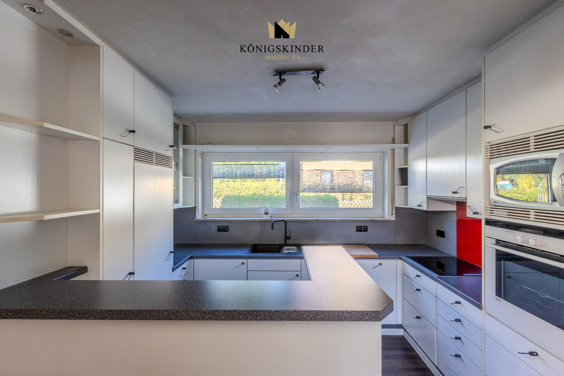 Im Erdgeschoss empfängt Sie ein offener Küchen- und Essbereich mit moderner Einbauküche und einer Theke zum Essbereich hin, die zum gemeinsamen Kochen und Verweilen einlädt. Im Anschluss befindet sich das große Wohnzimmer. Durch die leichte Hanglage zum Garten hin befindet sich hier der Balkon. Zusätzlich finden Sie im Erdgeschoss das Schlafzimmer mit Einbauschrank sowie ein Duschbad (Fußbodenheizung) mit separatem WC.