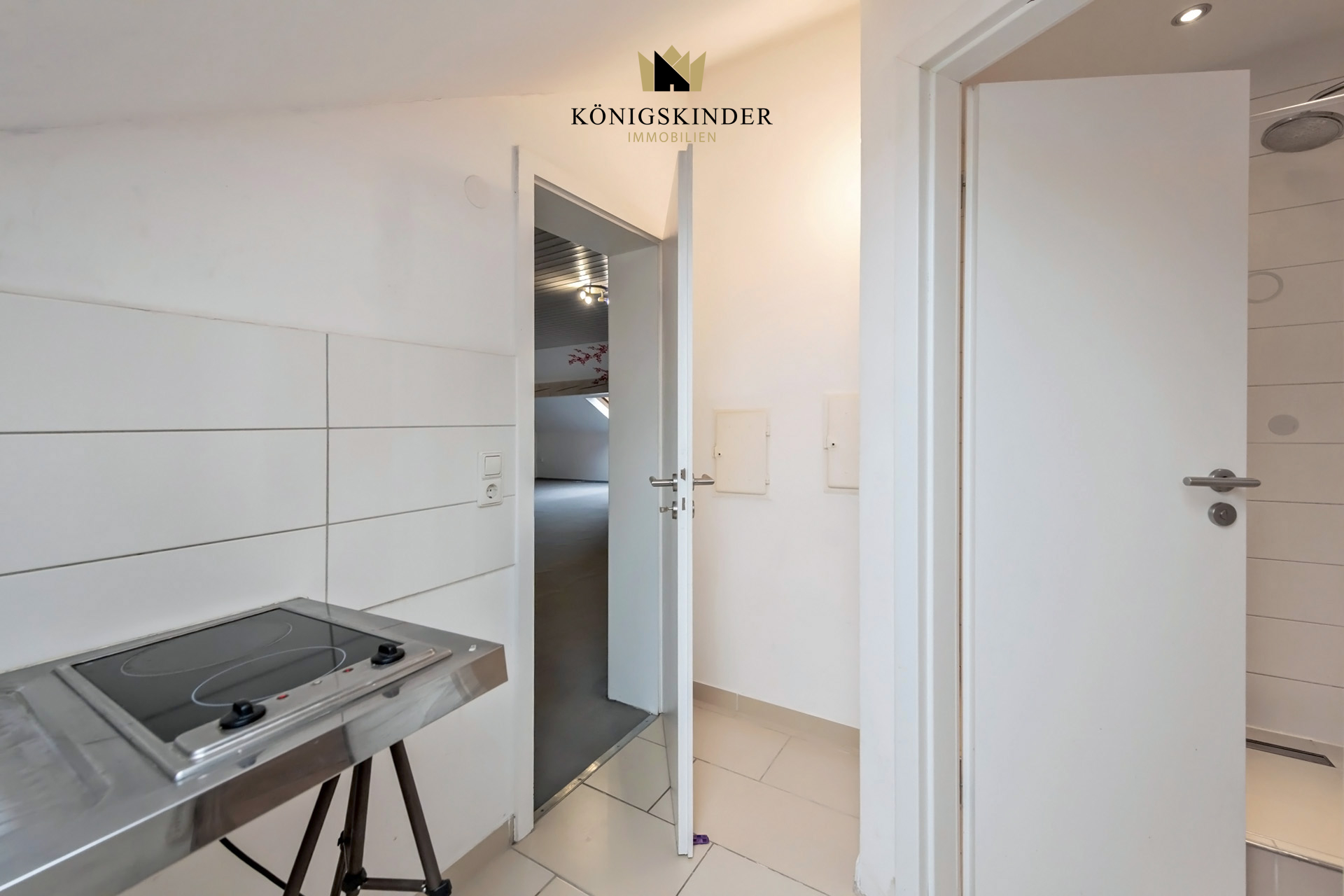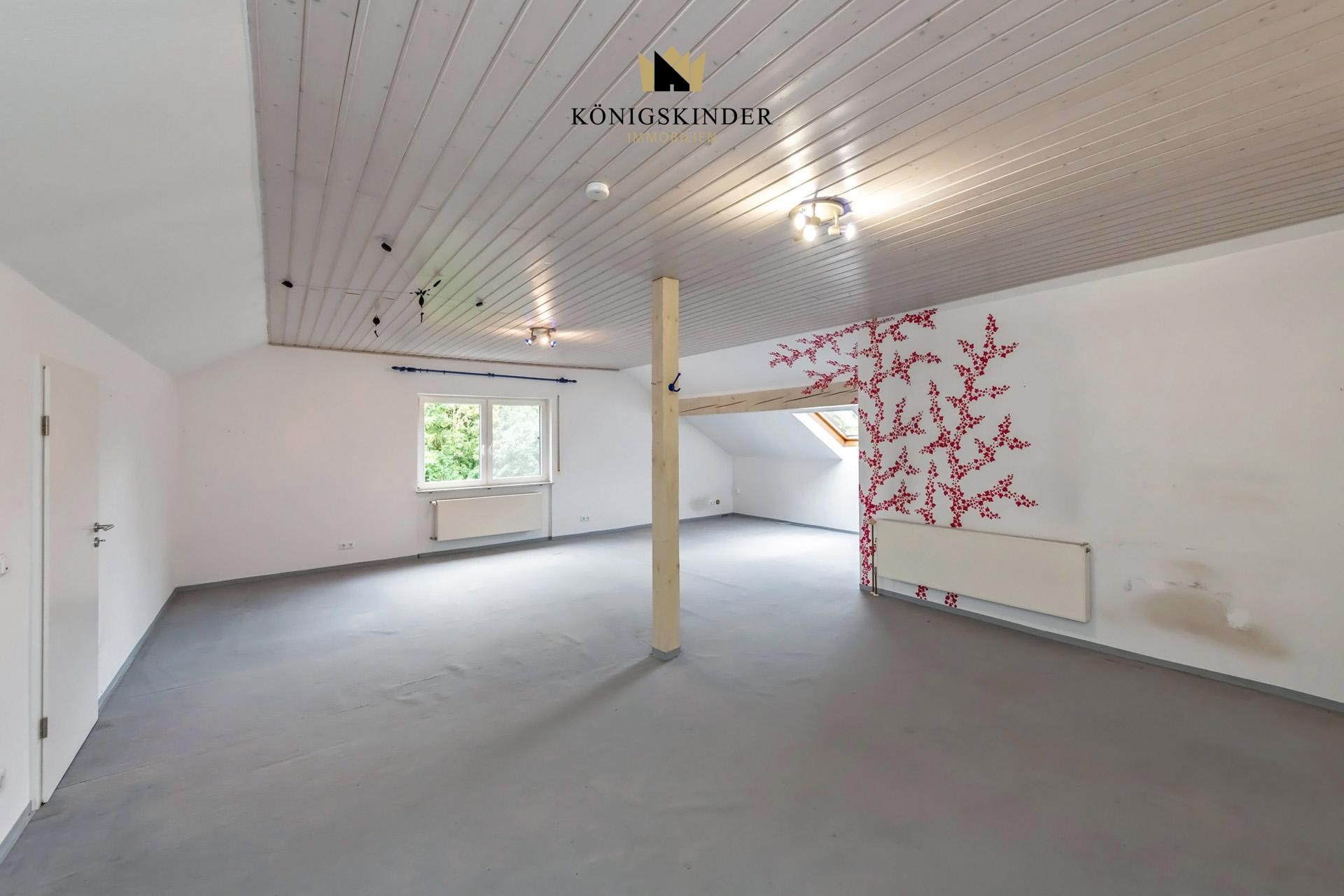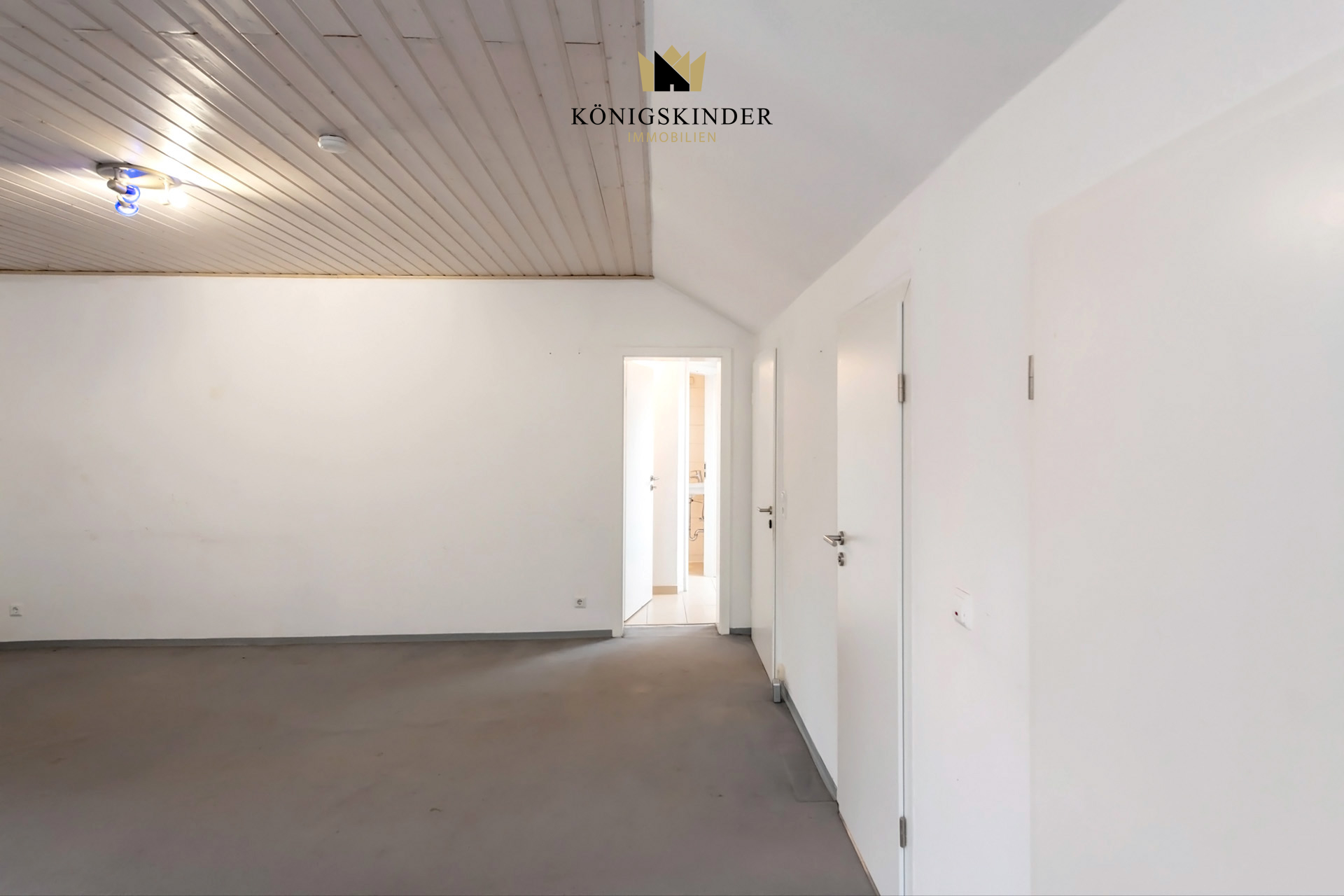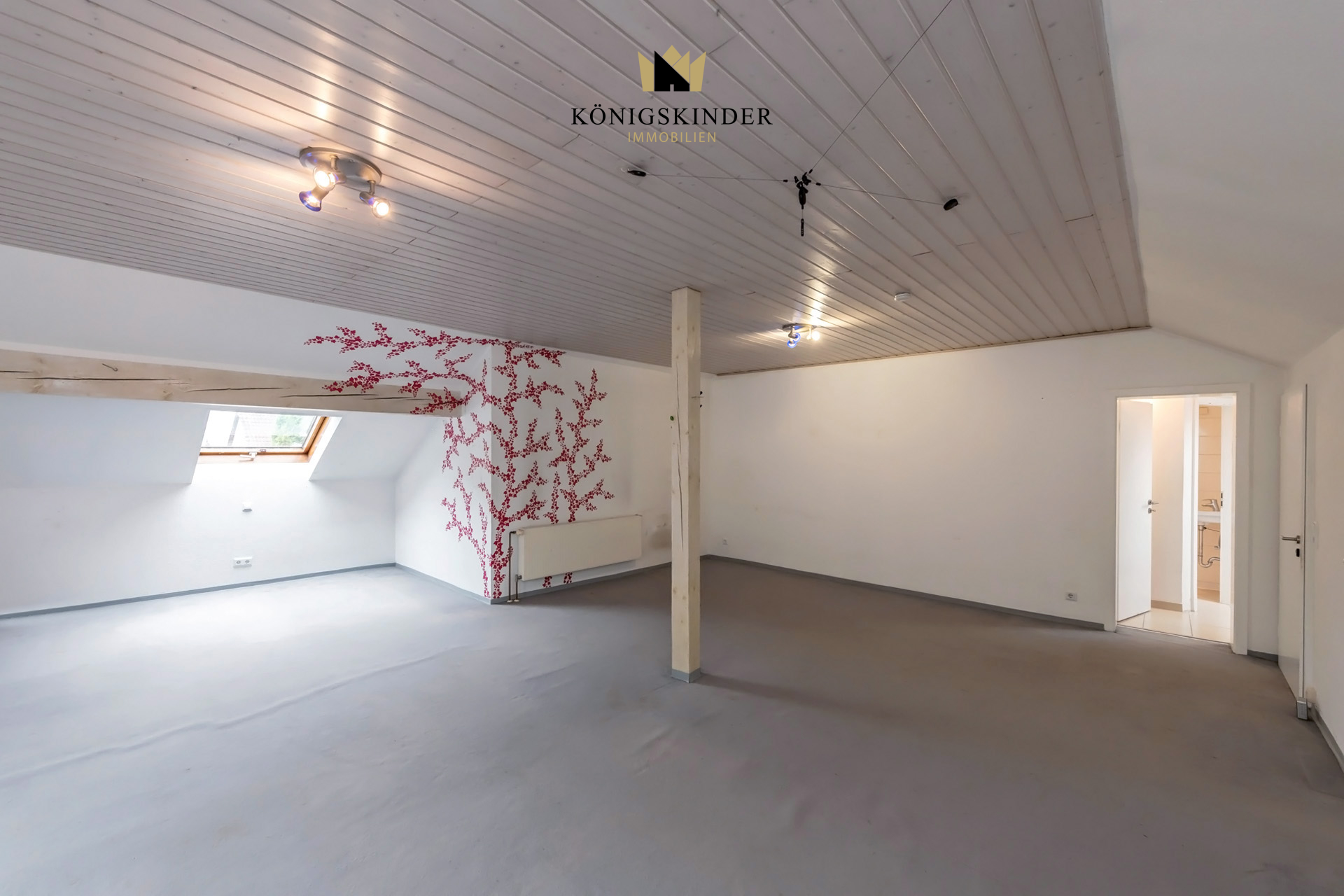 Das Dachgeschoss ist über eine Wendeltreppe erreichbar und als eigenständige Wohneinheit nutzbar. Die Einliegerwohnung verfügt über ein offenes Raumkonzept, ein eigenes Badezimmer sowie eine eingerichtete Küchenzeile. Der Bereich eignet sich gut für erwachsene Kinder, Gäste oder zur Vermietung.
