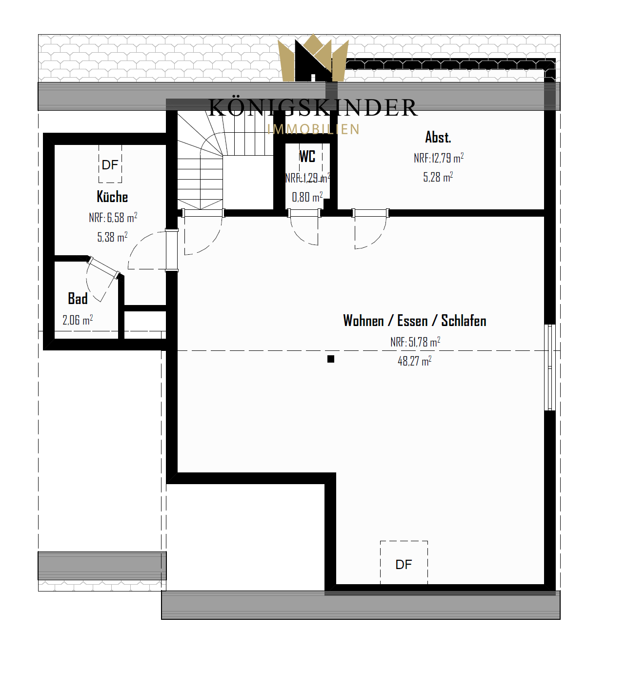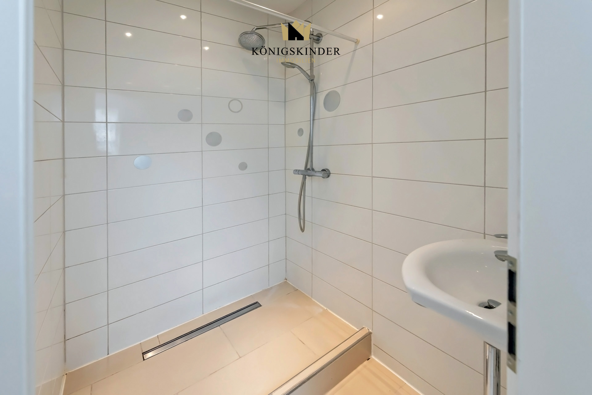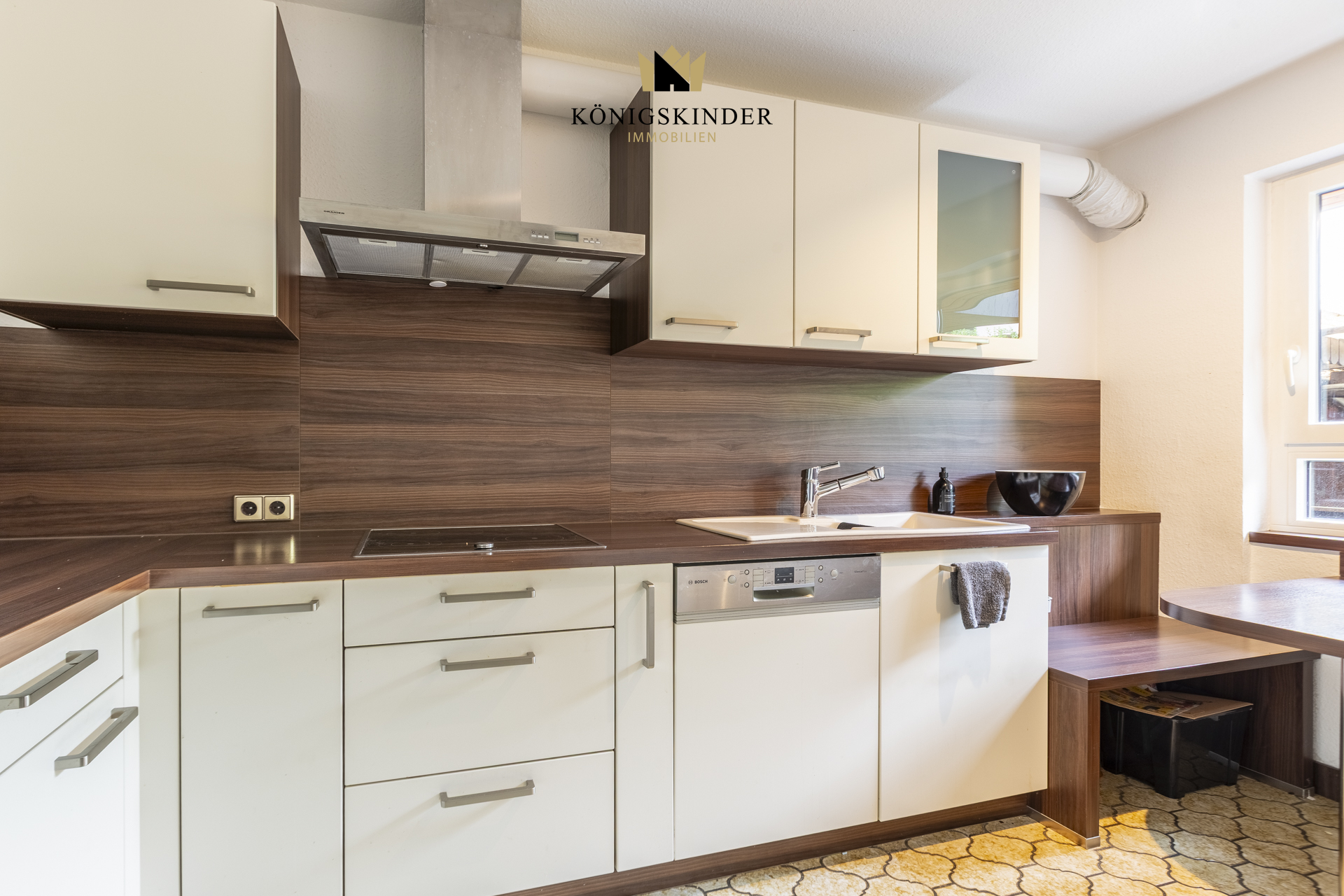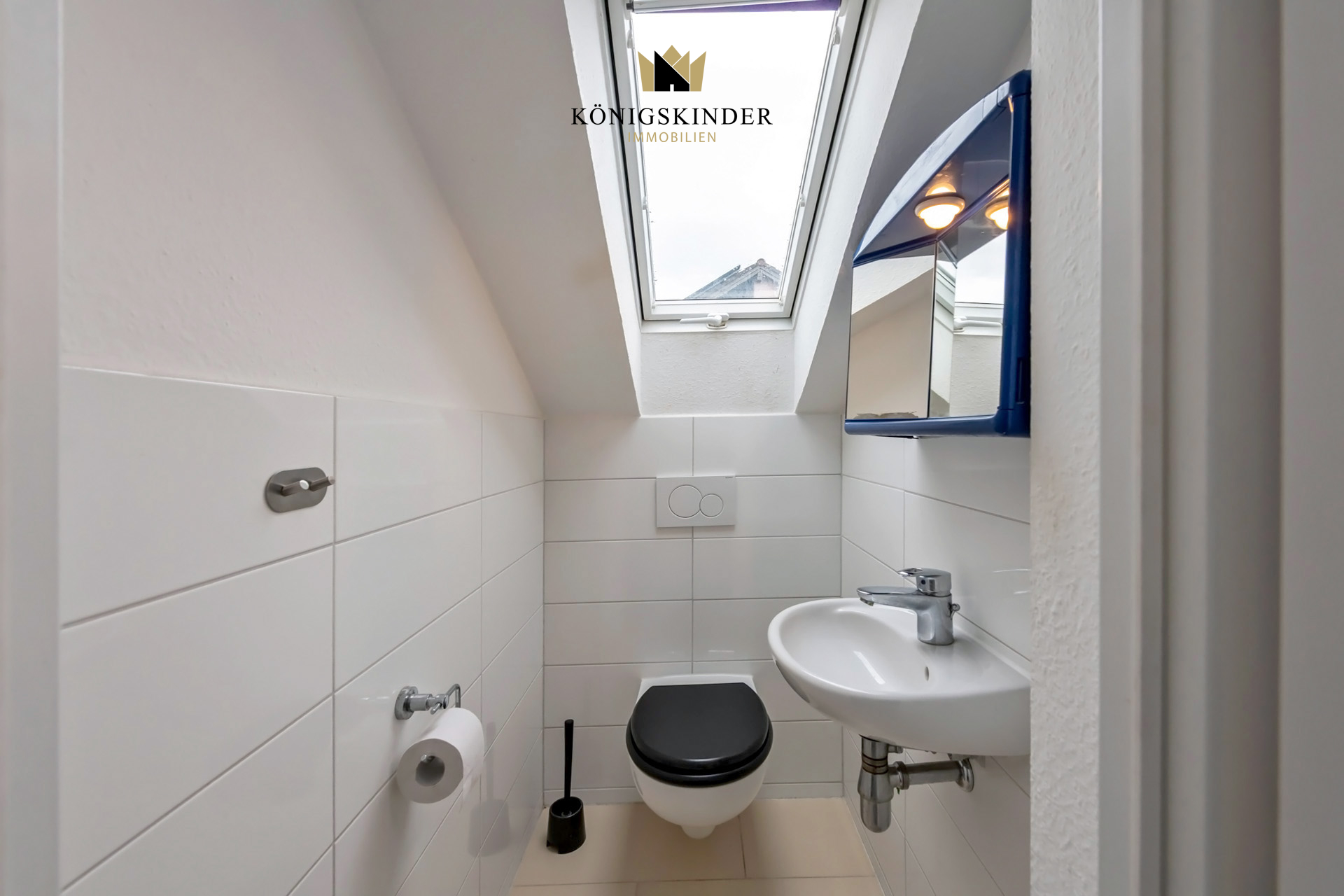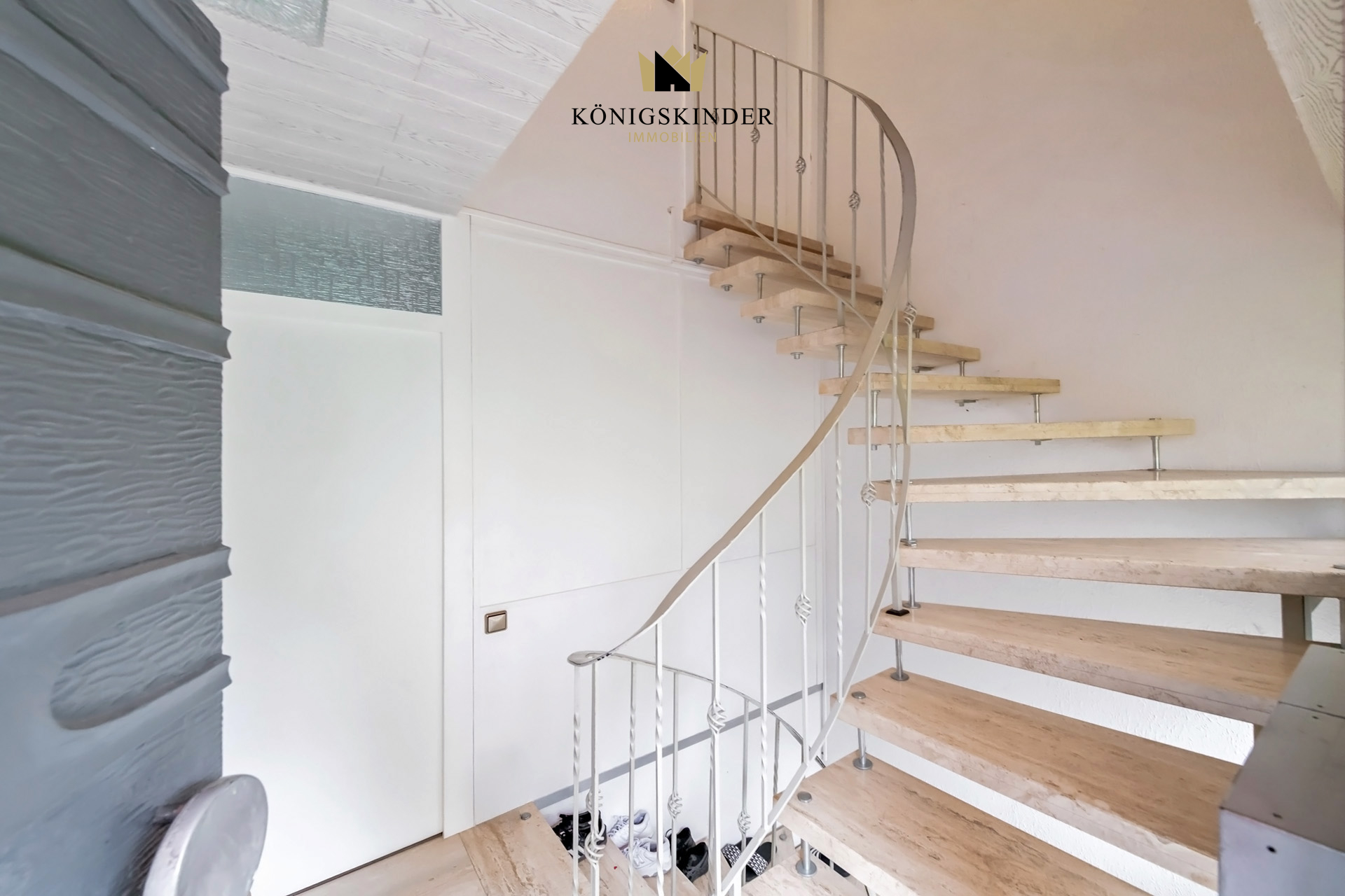 Das Dachgeschoss ist über eine Wendeltreppe erreichbar und als eigenständige Wohneinheit nutzbar. Die Einliegerwohnung verfügt über ein offenes Raumkonzept, ein eigenes Badezimmer sowie eine eingerichtete Küchenzeile. Der Bereich eignet sich gut für erwachsene Kinder, Gäste oder zur Vermietung.