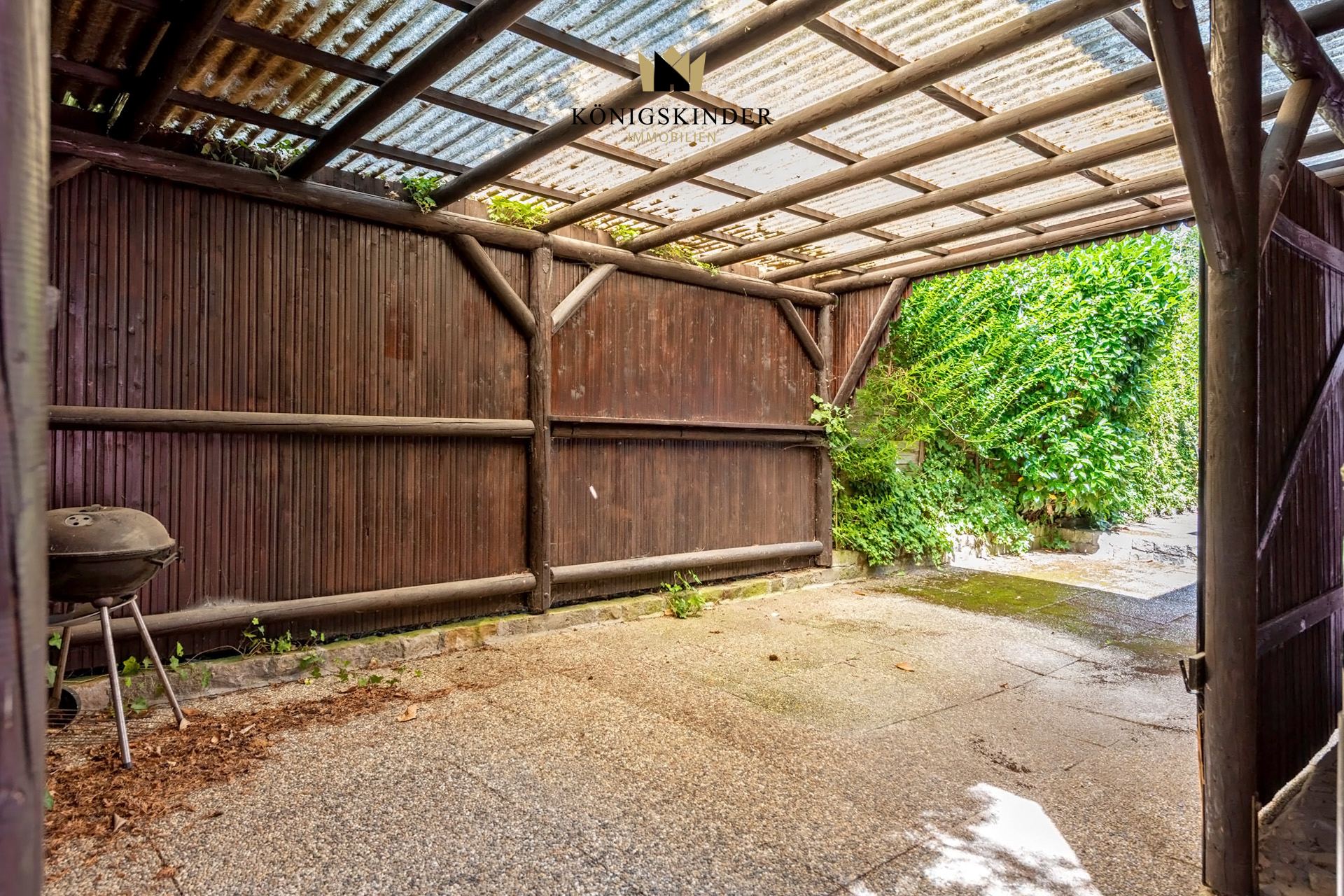 Das Erdgeschoss ist derzeit vermietet. Hier befinden sich der großzügige Wohn- und Essbereich mit offener Raumhöhe als Zentrum des Hauses, die Küche mit moderner Einbauküche im Holzdekor, ein Schlafzimmer, ein weiteres Zimmer, ein Tageslichtbad sowie ein separates WC. Vom Essbereich aus gelangt man direkt auf die überdachte Terrasse und in den gepflegten Garten.