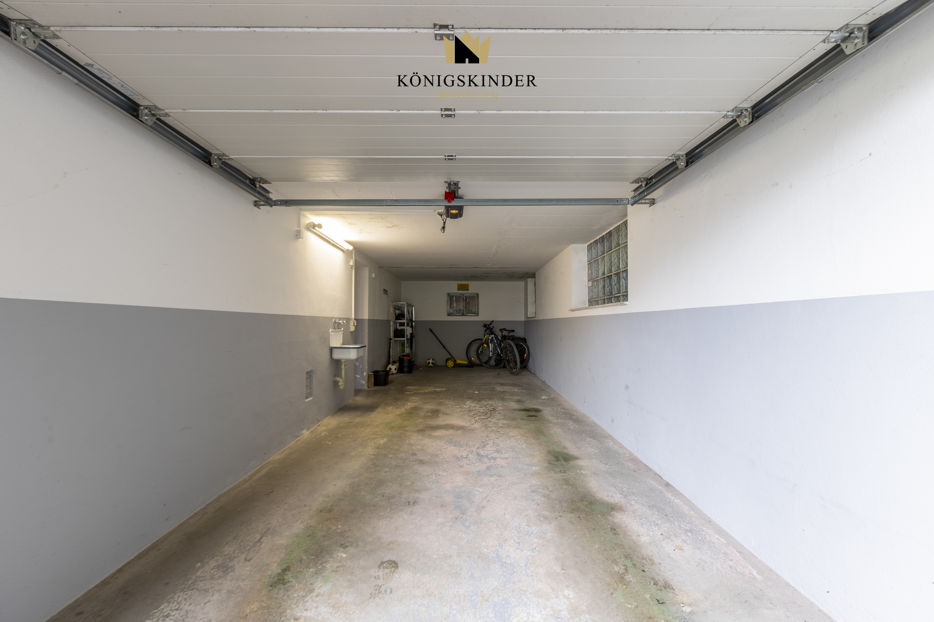 Eine Garage mit Platz für zwei Fahrzeuge in Reihe sowie zusätzliche Stellplätze auf dem Grundstück sind vorhanden.