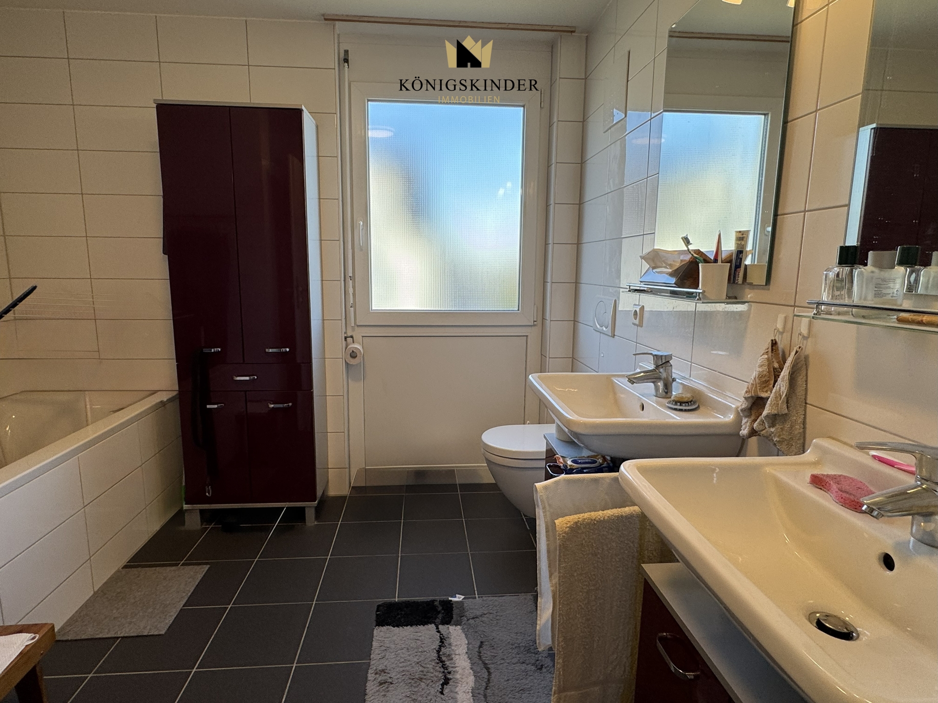 Das helle, modern gestaltete Badezimmer verfügt über eine ebenerdige Dusche, eine Badewanne, Toilette und Waschtisch, zusätzlich gibt es ein separates Gäste-WC, was den Wohnkomfort erhöht. Die große Einbauküche ist Bestandteil der Wohnung und lädt zum Kochen und Genießen ein.