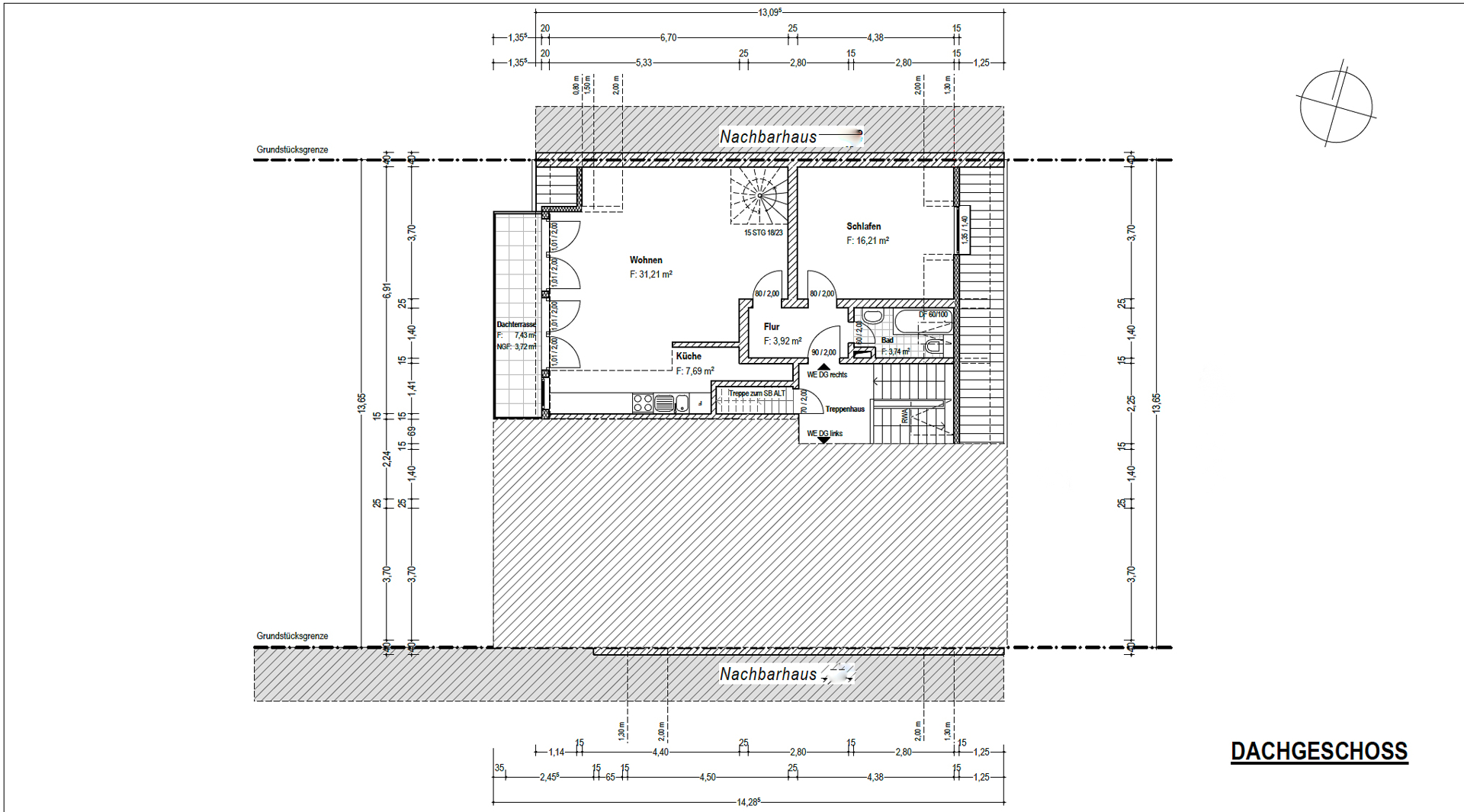 Fassadeoffene Wohnküche mit BalkonKücheDachterrasse untenSchlafzimmerBadezimmer untenArbeitszimmer obenArbeits- oder Schlafzimmer - obenBadezimmer obenGrundriss DGGrundriss DG+1große Dachterrasse oben