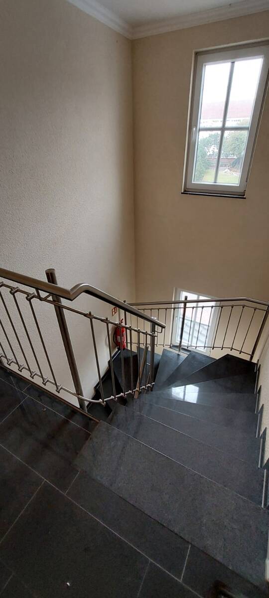 Sie betreten die Villa Vivaldi durch ein exklusiv gestaltetes Treppenhaus, mit schwarzem Granit und Edelstahlgeländer.