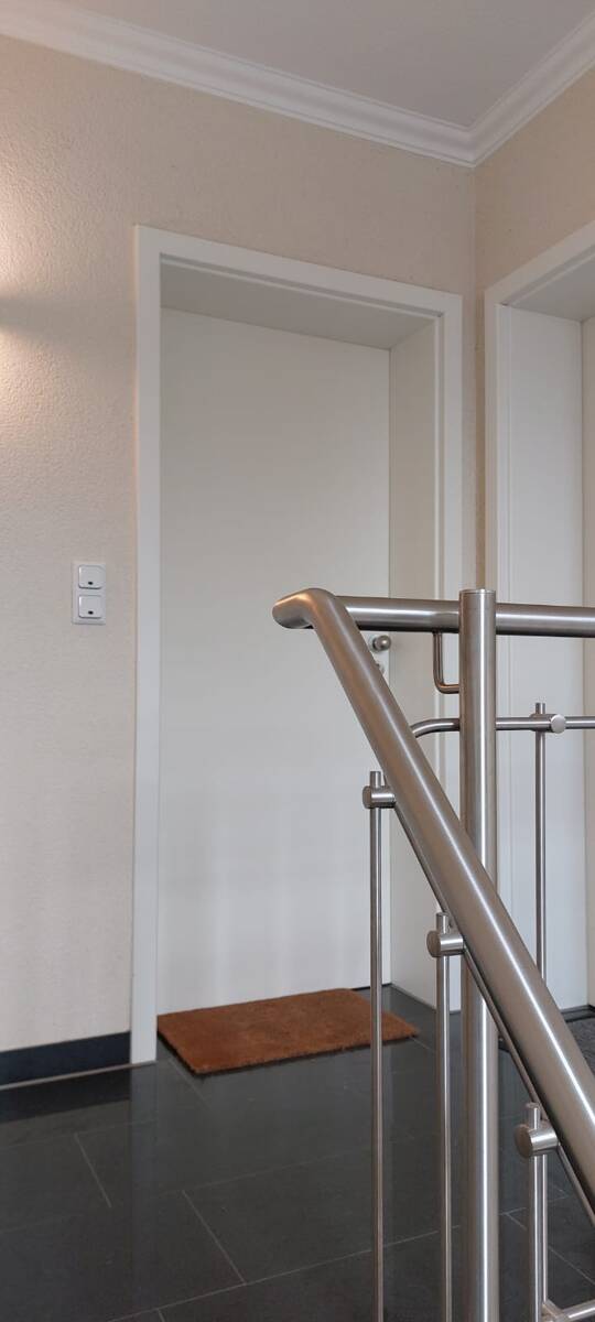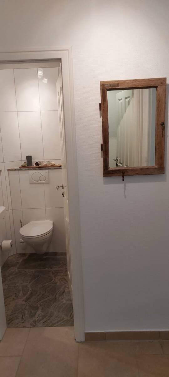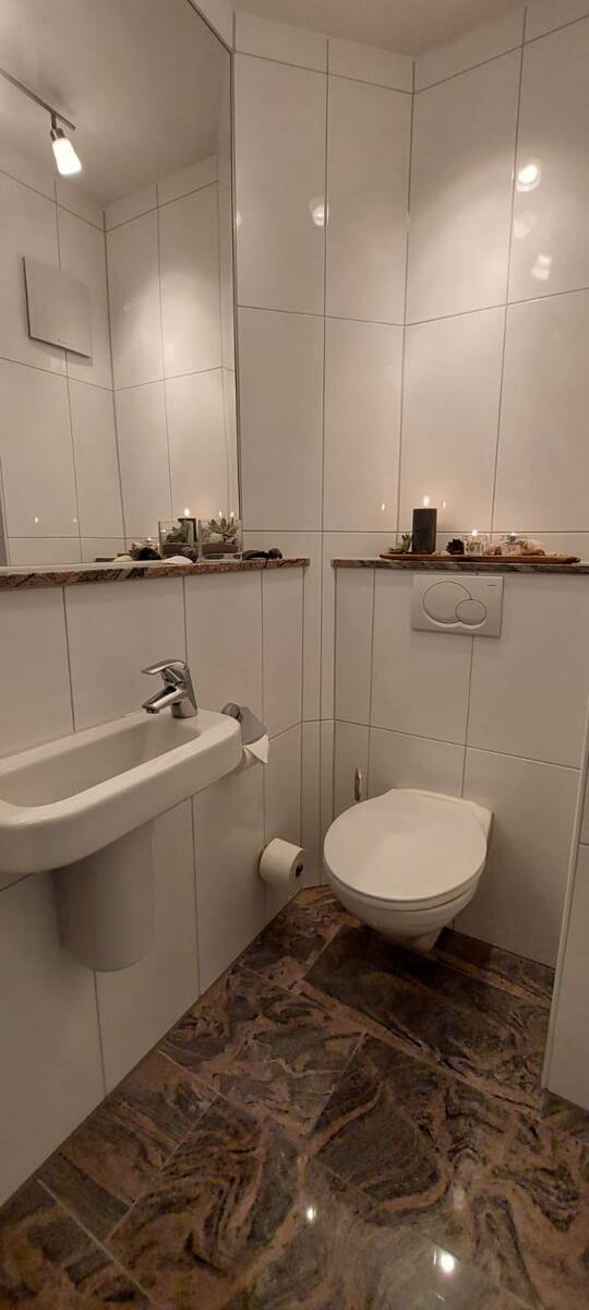 Die Maisonette Wohnung befindet sich in der zweiten Etage. Man betritt zuerst den hellen Flur. Zur linken Seite befindet sich das Gäste-WC, welches hochwertig mit Villeroy und Boch Keramik, Granitboden und Fußbodenheizung ausgestattet ist. Zur rechten Seite ist ein großzügiger Abstellraum, der genug Platz für die Garderobe, Schuhe etc. bietet.
