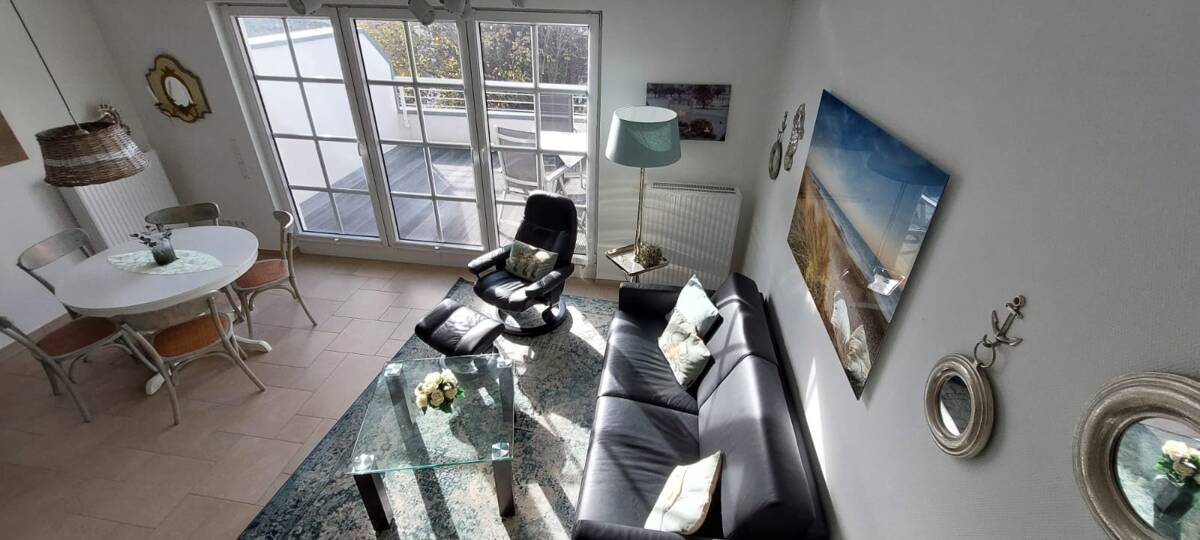Dachterrasse, wind- und sichtgeschützt. Wohnzimmer mit Schlafsofa für 2 Personen