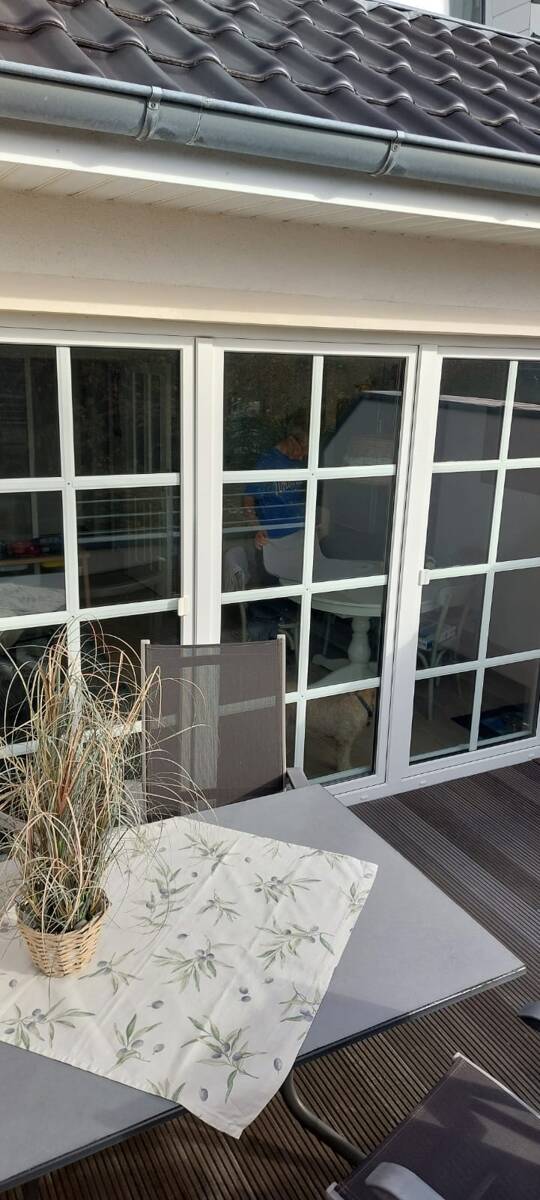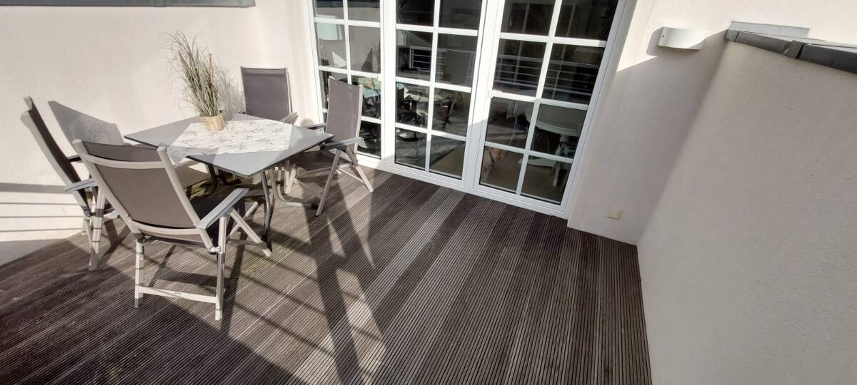 Durch eine große Glasstiltür kommt man in den lichtdurchfluteten Wohnbereich. Dieser beinhaltet die hochwertige weiße Einbauküche, den Essbereich und den Wohnbereich. Dieser Bereich ist komplett, so wie die obere Etage, mit hellen sandfarbenen Fliesen ausgestattet, die an den Sandstrand erinnern. Vor dem Wohnbereich befindet sich die große Dachterrasse, die mit Bangkirai Holz belegt ist. Die Dachterrasse hat eine Größe von ca. 14 qm. Die Terrasse ist wind- und sichtgeschützt und bietet genügend Privatsphäre.