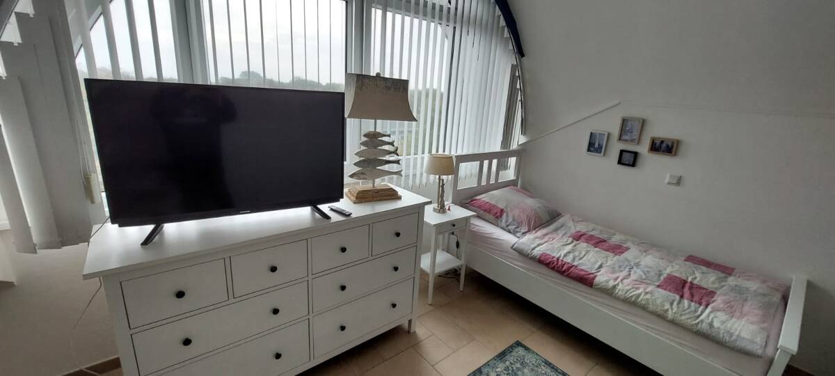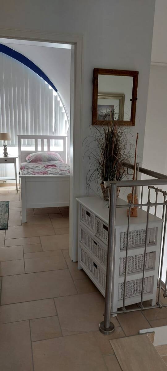 Vom Wohnbereich gelangt man über eine helle Marmortreppe ins Dachgeschoss. Geradeaus befindet sich das luxuriöse Badezimmer, das ganz im Stil, wie das Gäste-WC gestaltet ist, inkl. Fußbodenheizung. Zur linken Seite betritt man das erste große Schlafzimmer mit großem bodenflächigem Rundbogenfenster. Lassen Sie die Fenster nachts geöffnet, so können Sie mit Meeresrauschen einschlafen. Das Schlafzimmer ist mit einem Doppelbett und diversen Schränken eingerichtet. Das zweite Schlafzimmer, ebenfalls mit Rundbogenfenster, bietet einen Ausblick bis auf das Festland und hat zwei Einzelbetten und diverse Schränke.