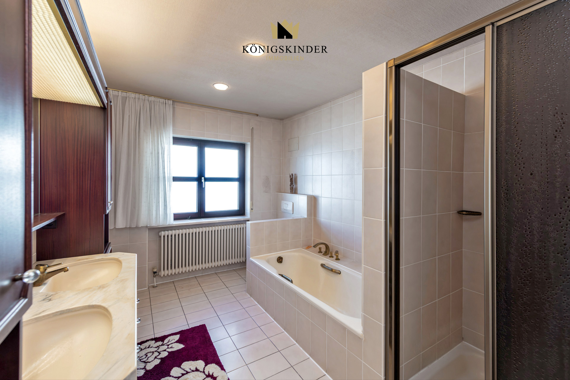 Das Dachgeschoss ist die Schlafetage mit zwei verbundenen Schlafzimmern - nur getrennt durch eine offene Ankleide, und das Hauptbad - großzügig und geschickt gelöst. Dieser Raum hat Ausgang zu einem uneinsehbaren Balkon (etwa 9 m² groß) mit freiem Blick ins Tal der Rems - die Stadt zu Ihren Füßen.