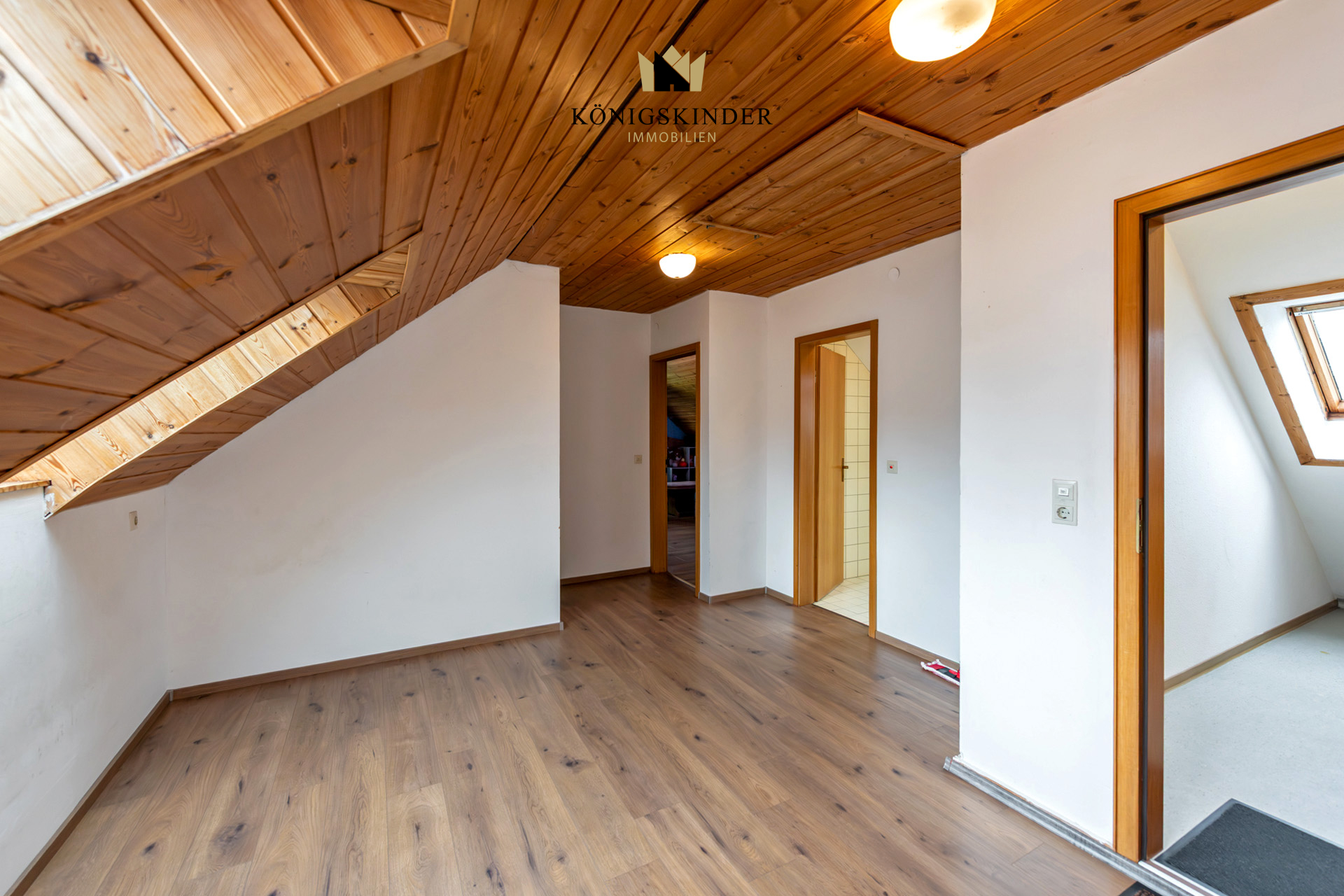Im Dachgeschoss gibt es ebenfalls 4 sehr geräumige Zimmer und ein Duschbad, die sich um eine großzügige Diele gruppieren.