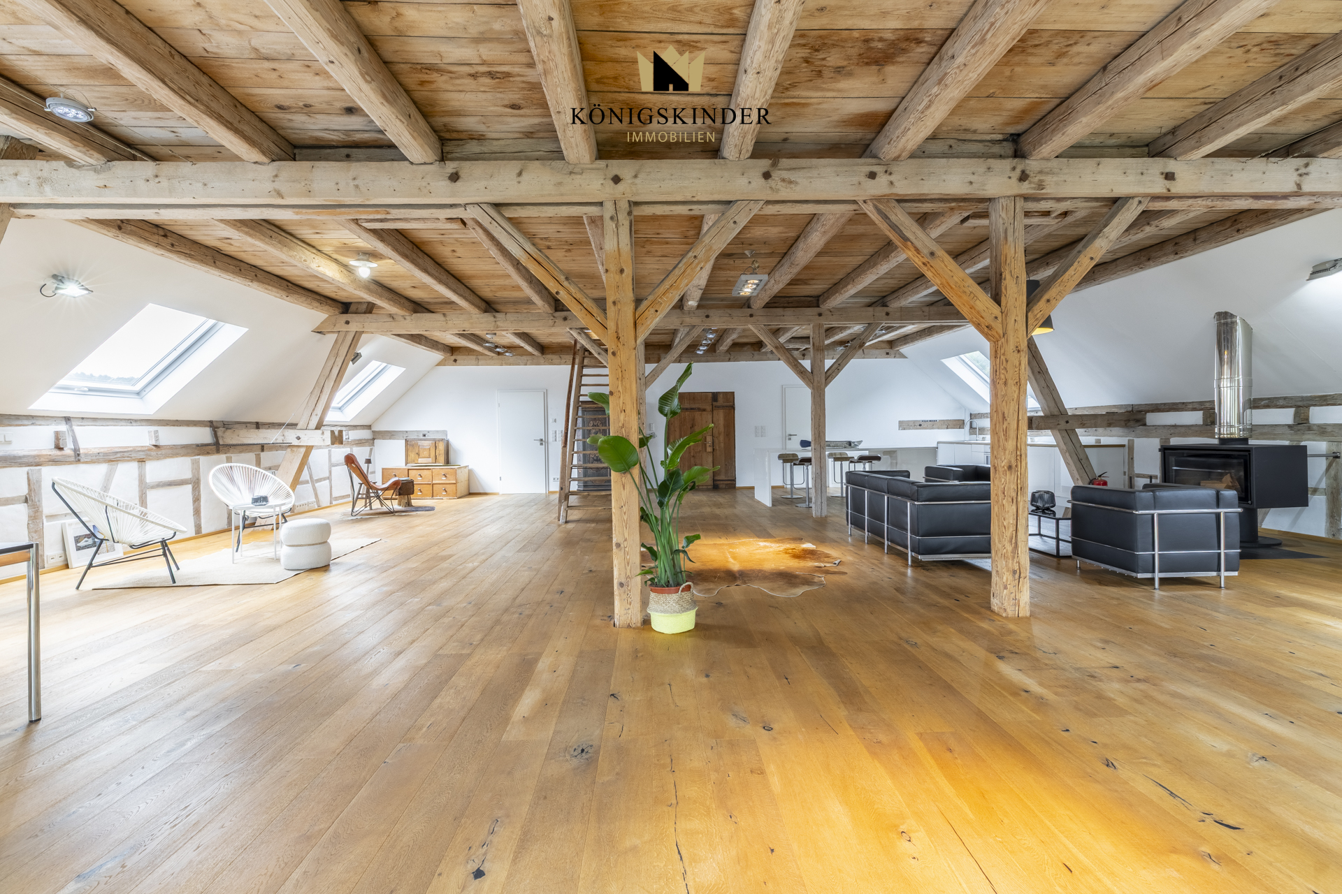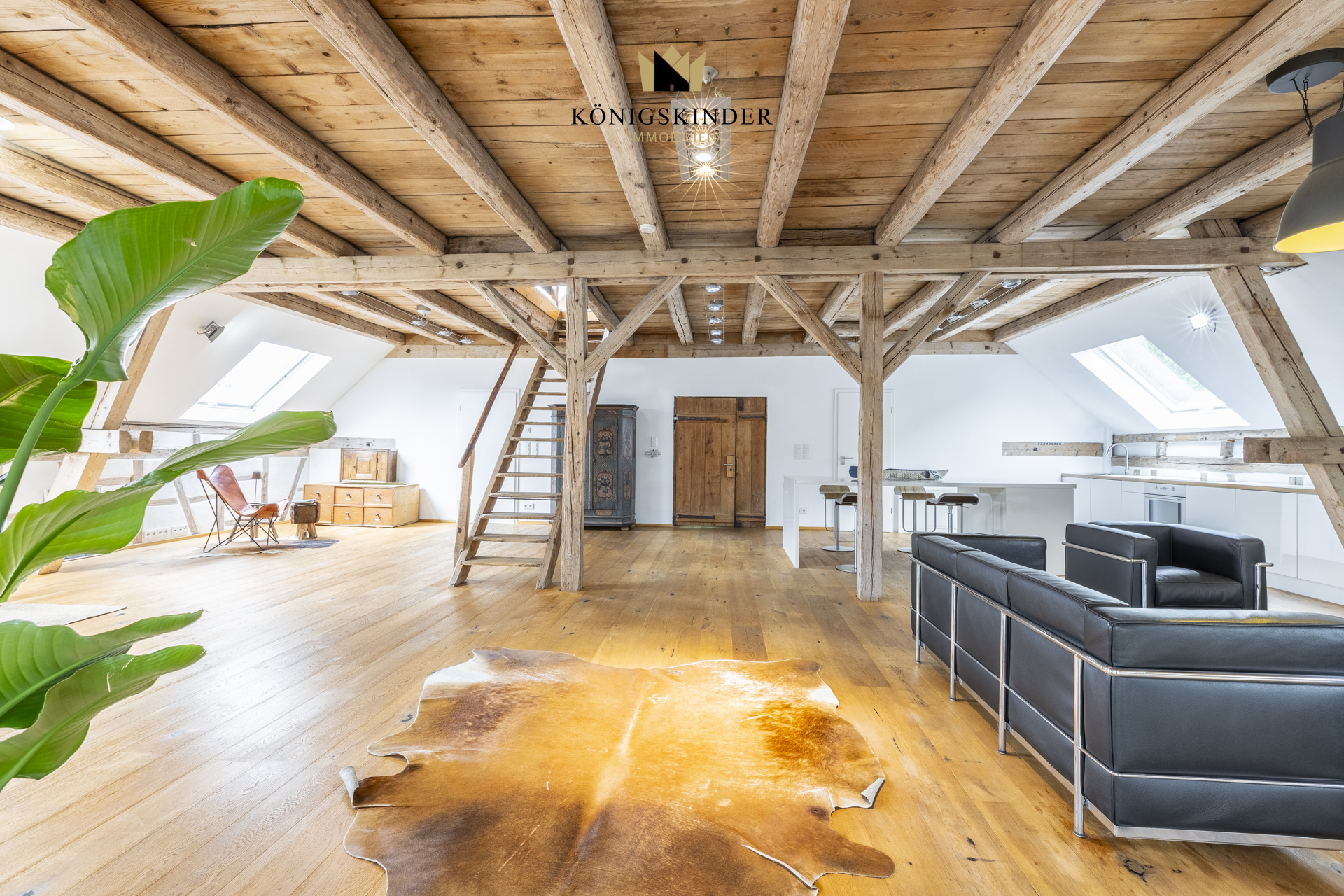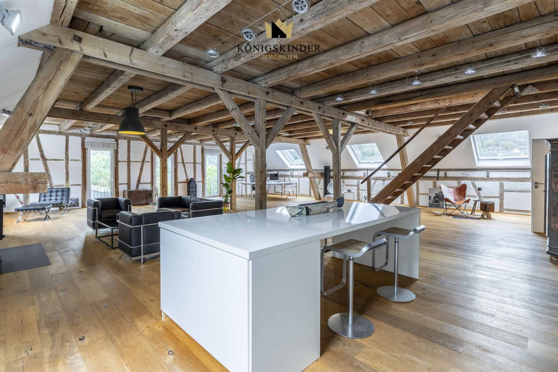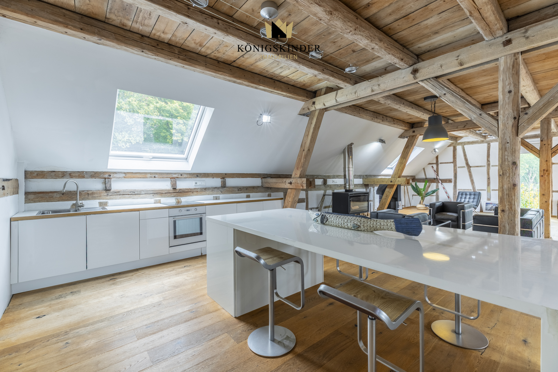 Die sichtbaren Holzbalken, der offene Schnitt und die großzügige Fläche schaffen ein Raumgefühl, das man nicht planen kann – es ist einfach da. Die moderne Küche fügt sich unaufdringlich ins Gesamtbild ein und bietet Platz für gemeinsames Kochen oder kurze Pausen im Arbeitsalltag.