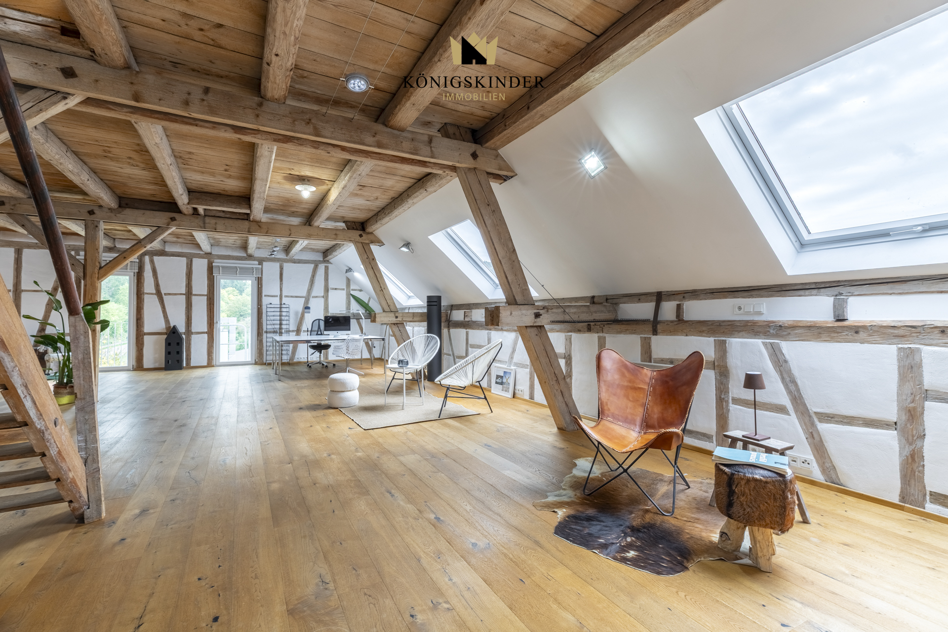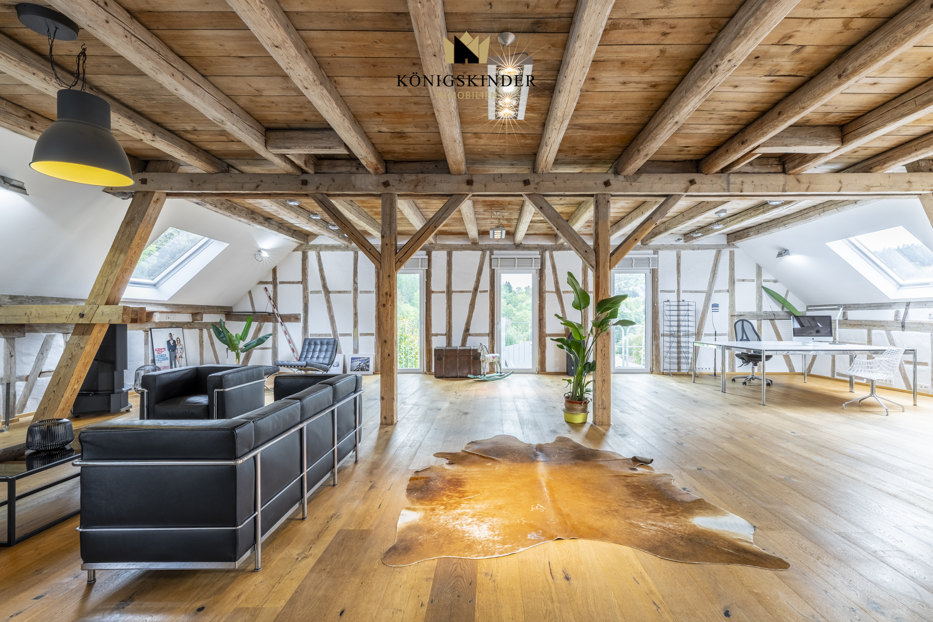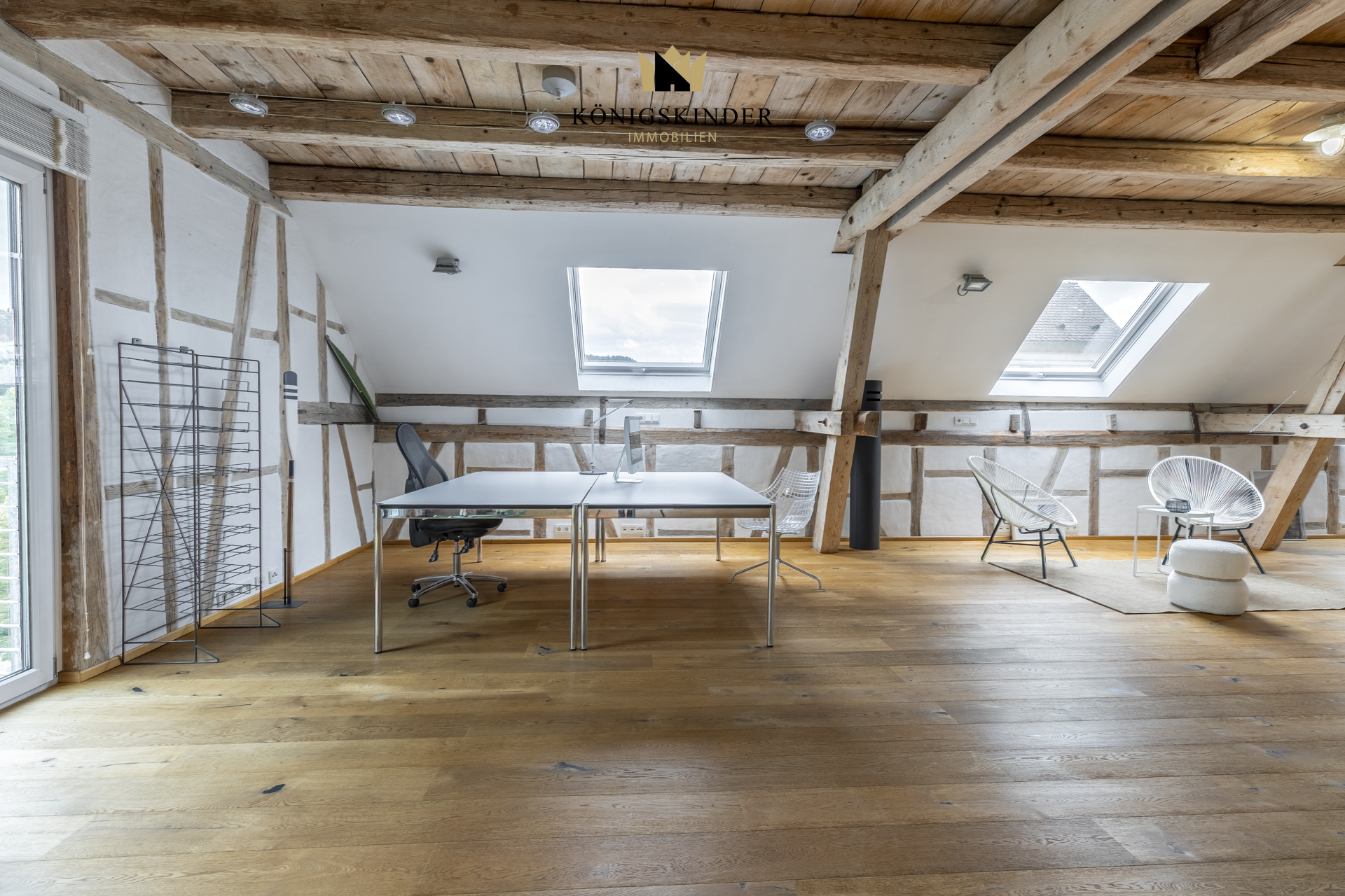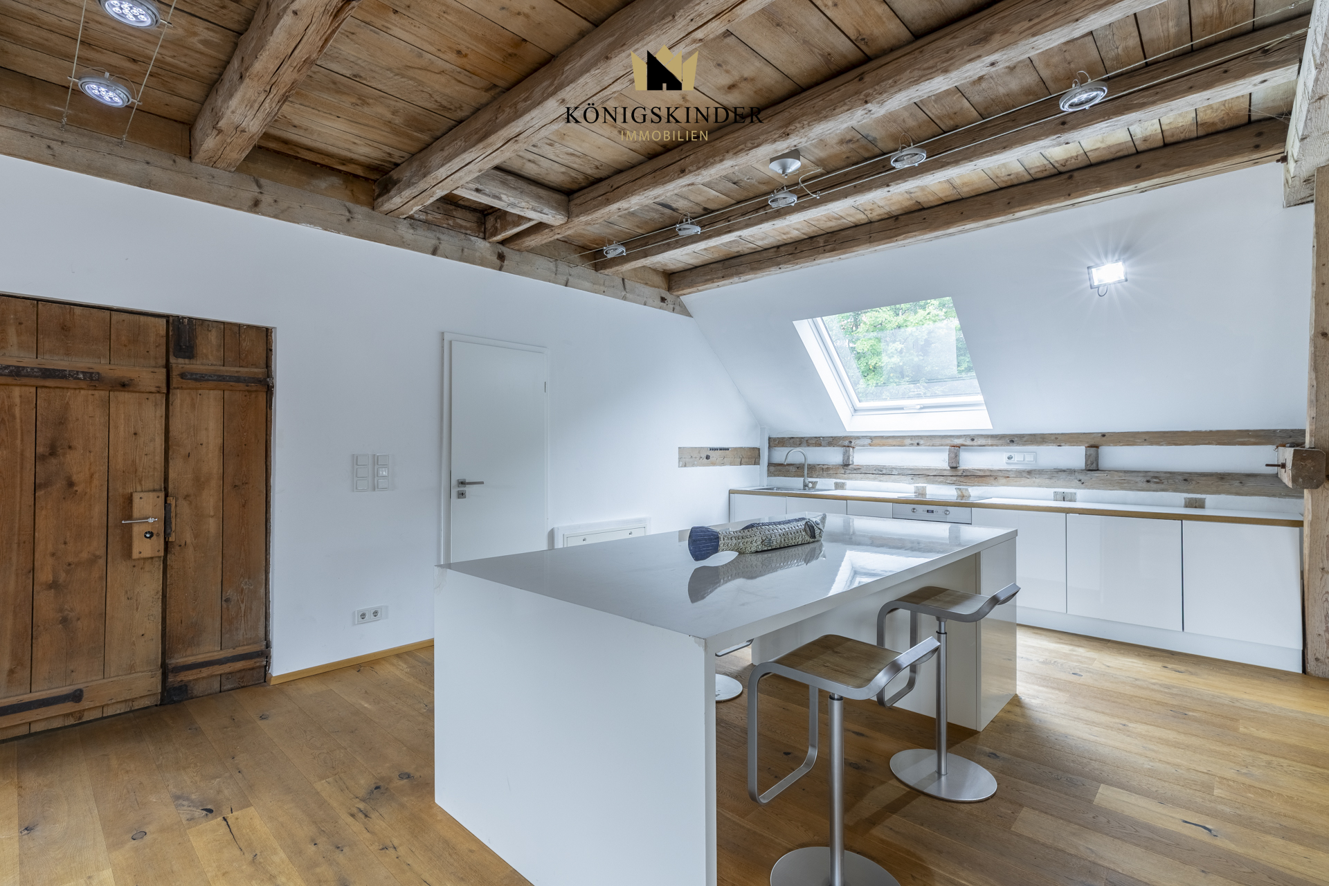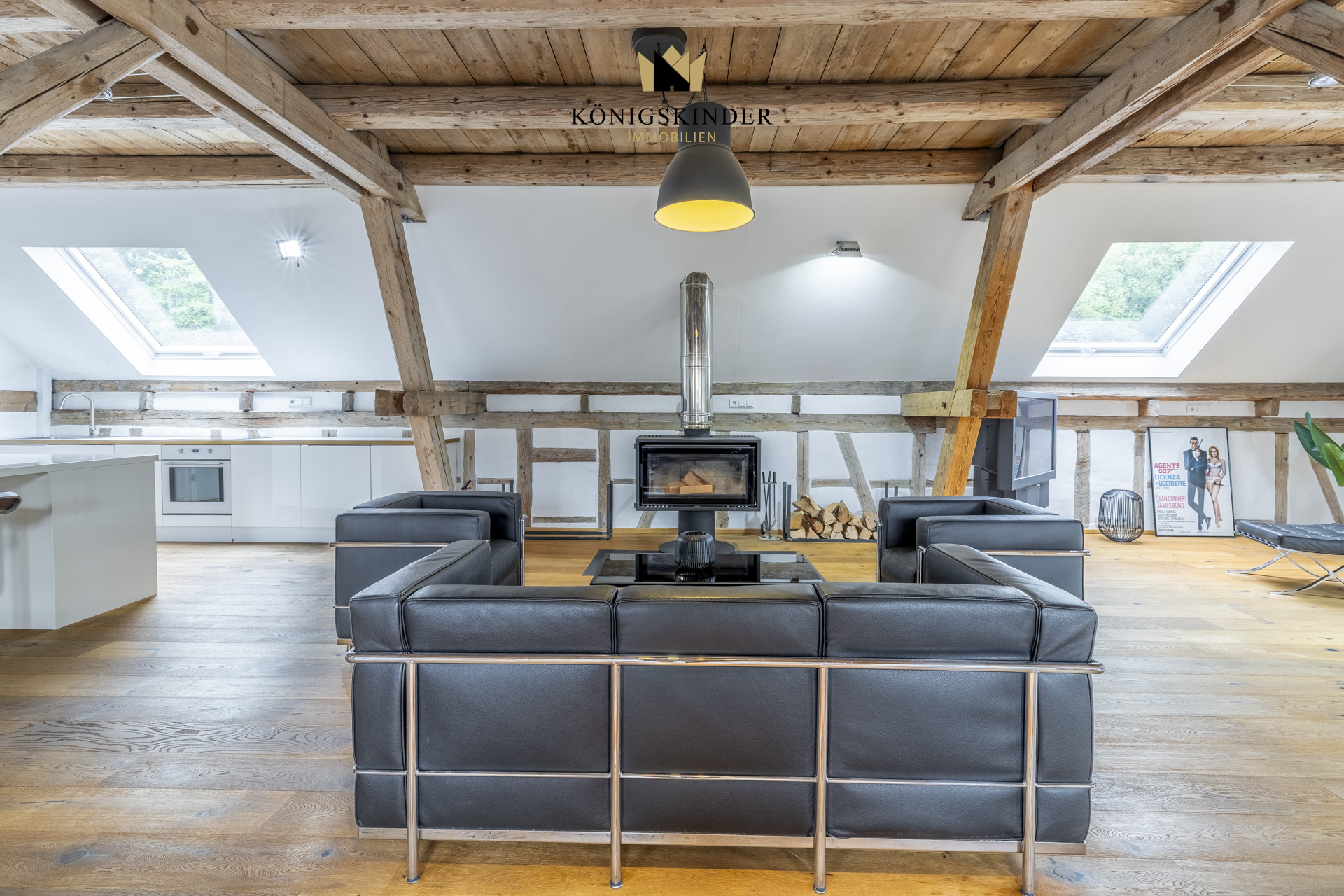 Die sichtbaren Holzbalken, der offene Schnitt und die großzügige Fläche schaffen ein Raumgefühl, das man nicht planen kann – es ist einfach da. Die moderne Küche fügt sich unaufdringlich ins Gesamtbild ein und bietet Platz für gemeinsames Kochen oder kurze Pausen im Arbeitsalltag.