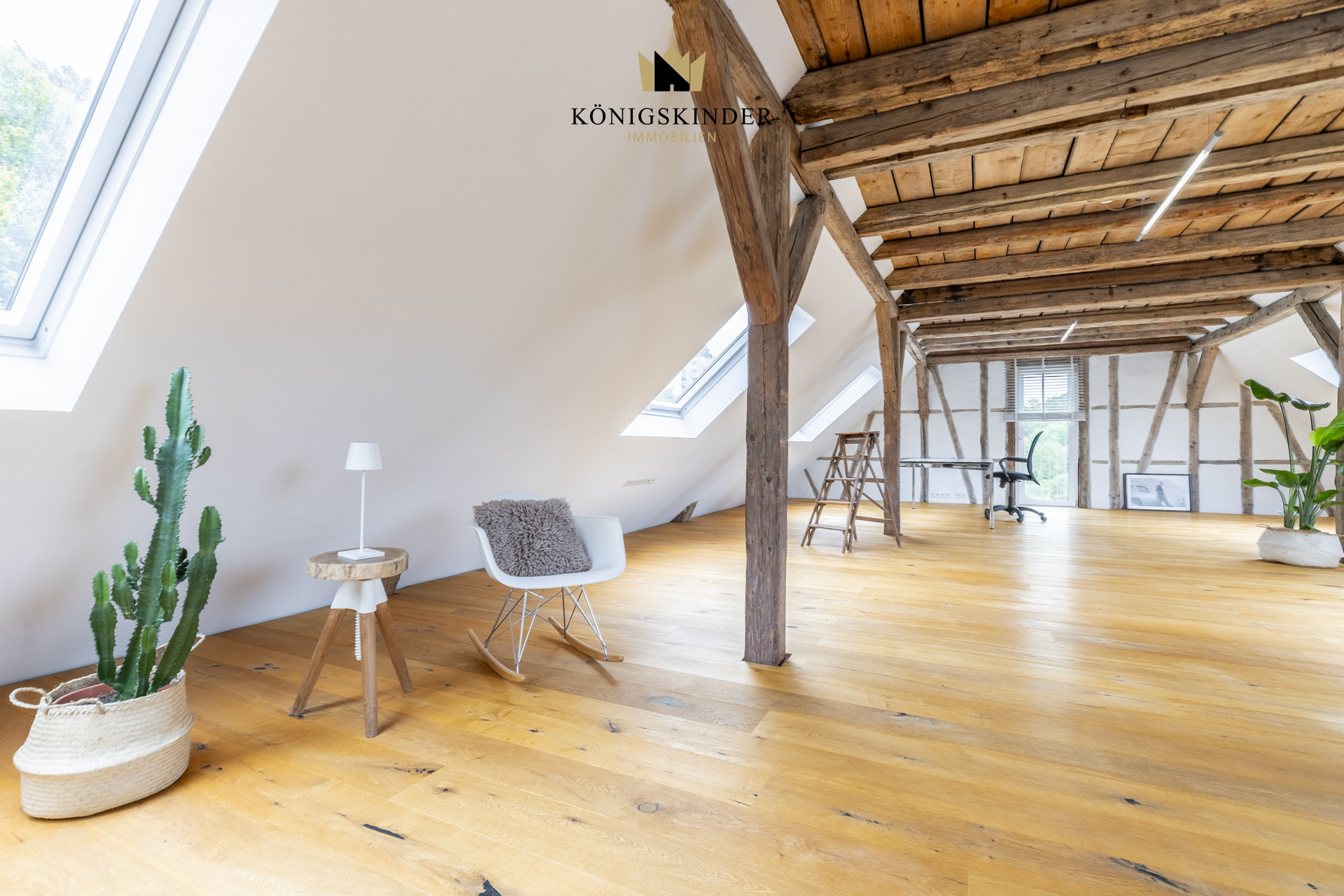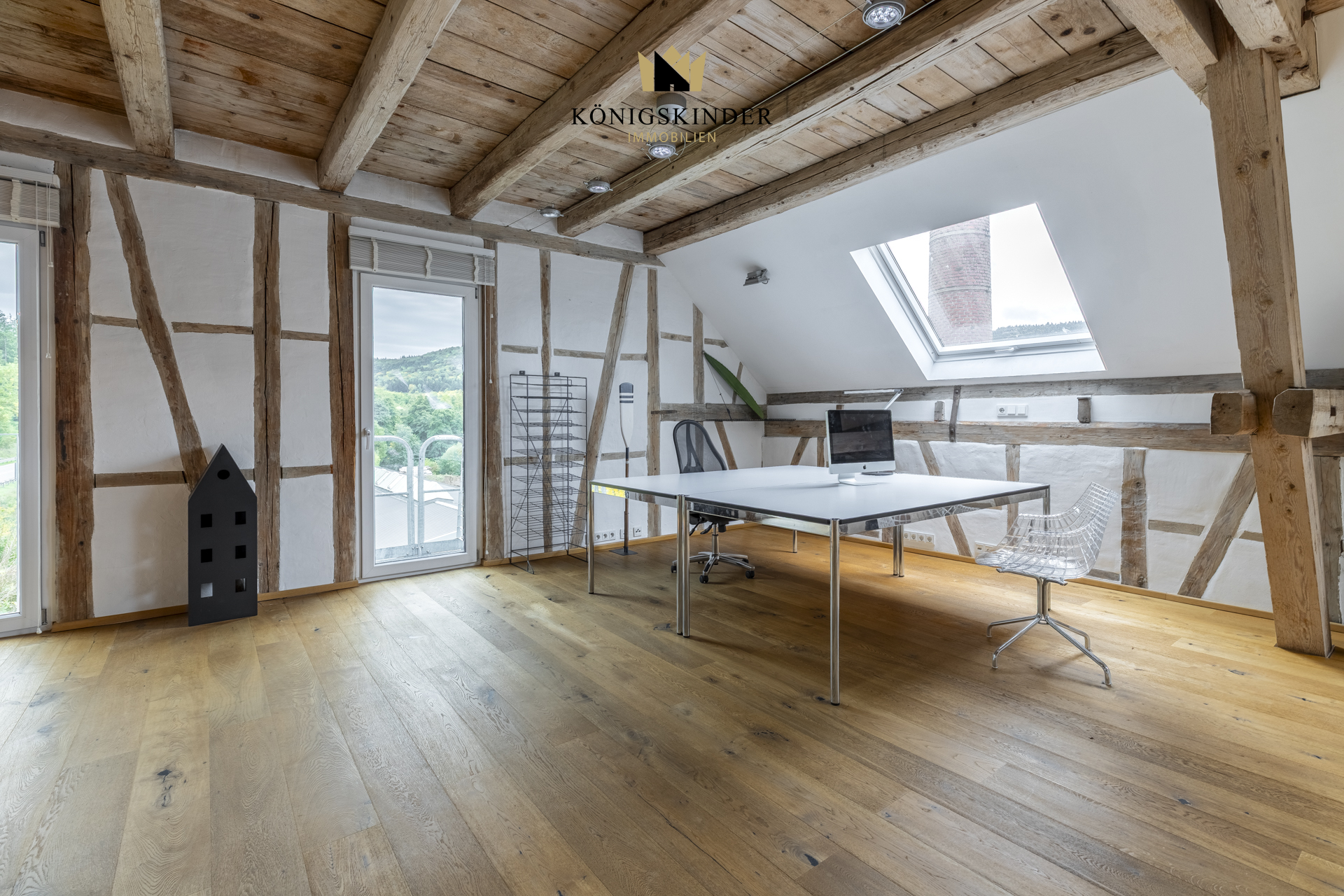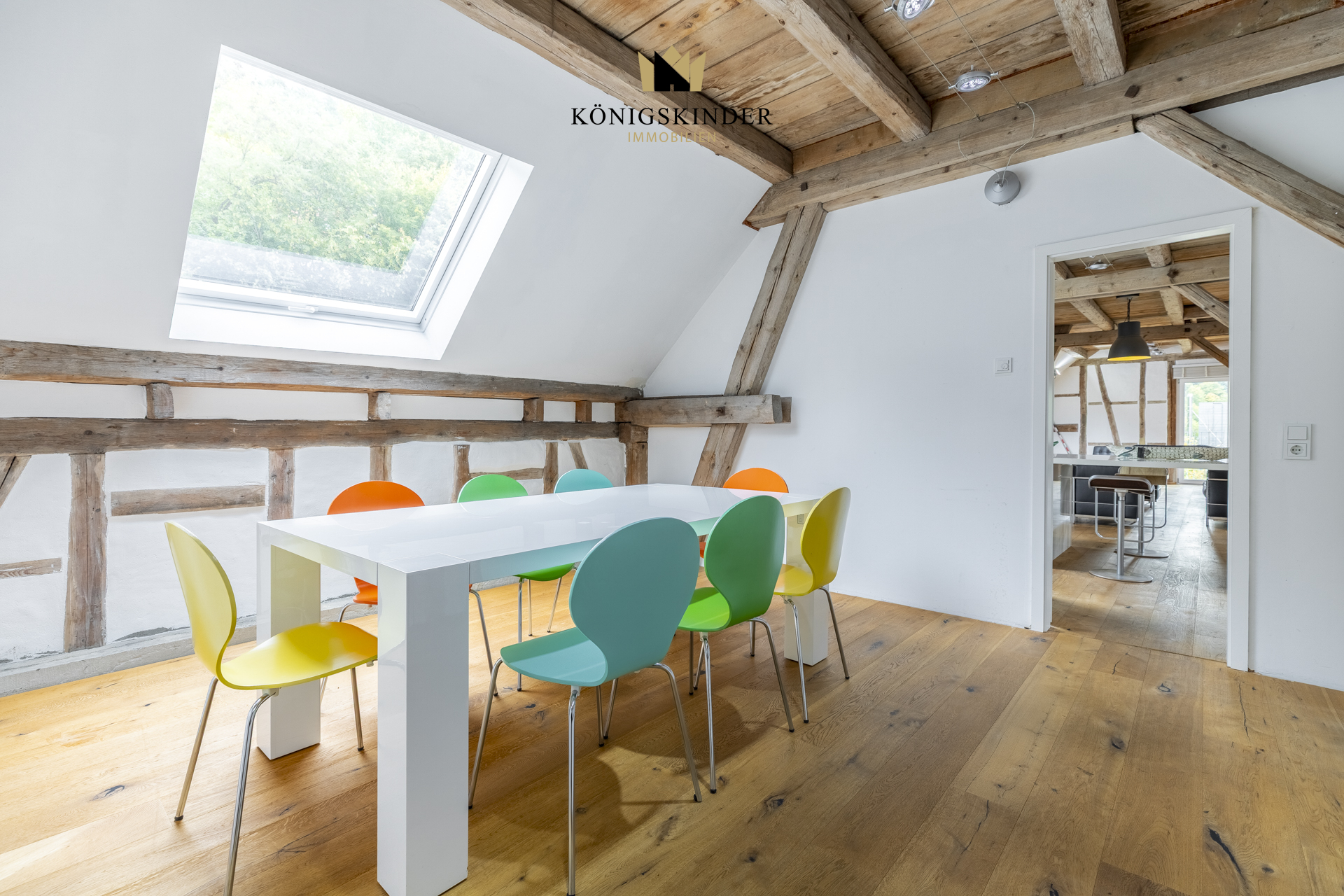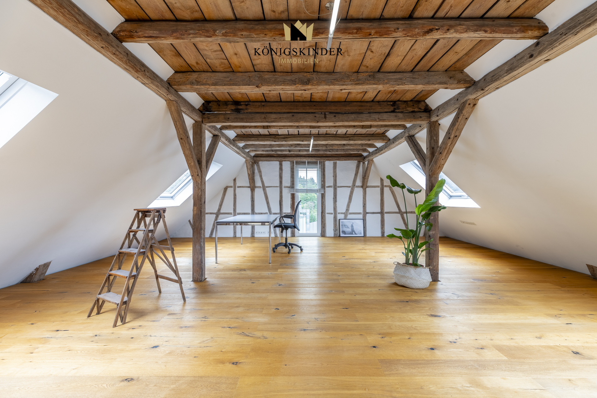 Die sichtbaren Holzbalken, der offene Schnitt und die großzügige Fläche schaffen ein Raumgefühl, das man nicht planen kann – es ist einfach da. Die moderne Küche fügt sich unaufdringlich ins Gesamtbild ein und bietet Platz für gemeinsames Kochen oder kurze Pausen im Arbeitsalltag.