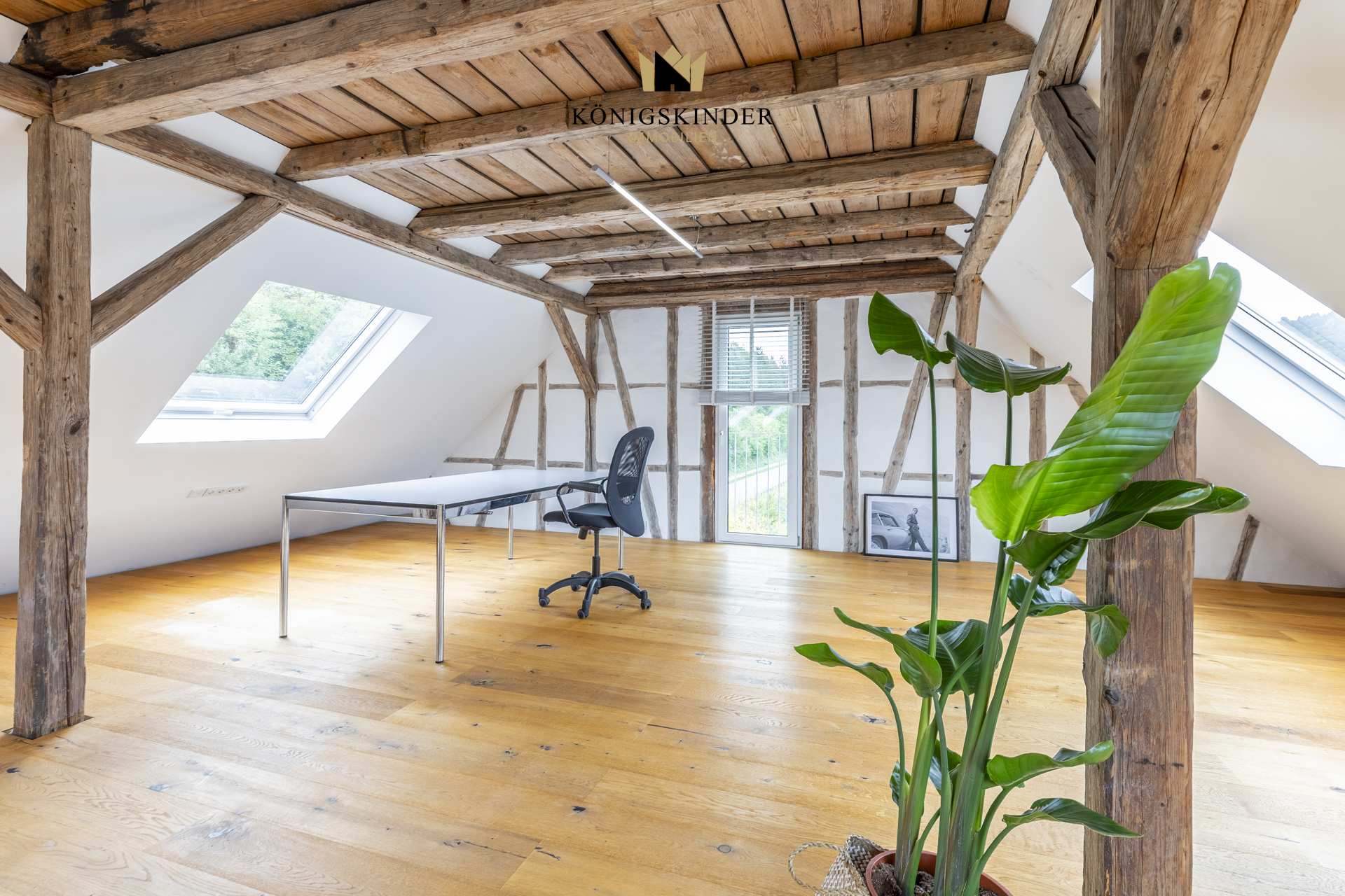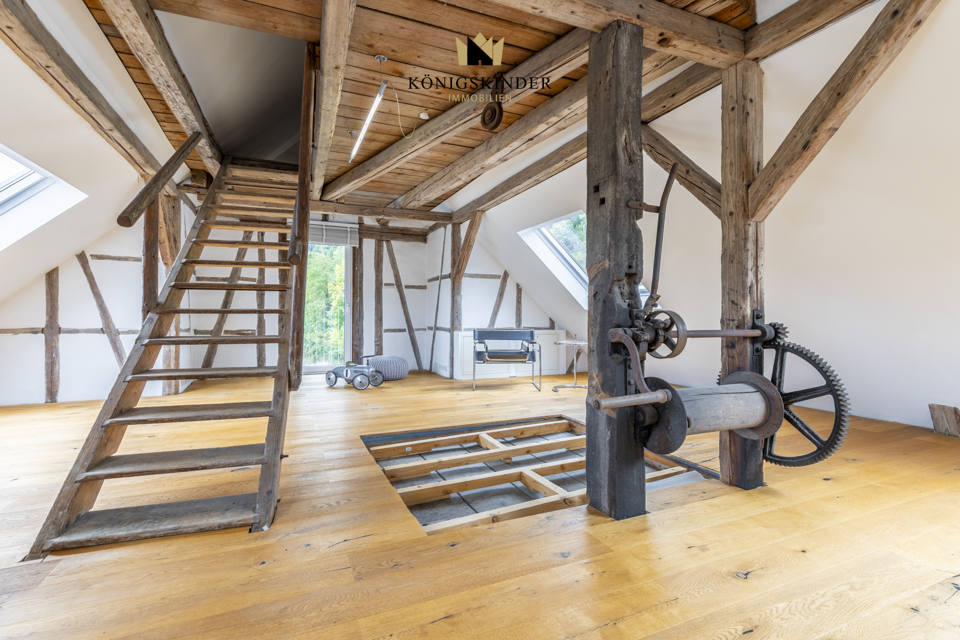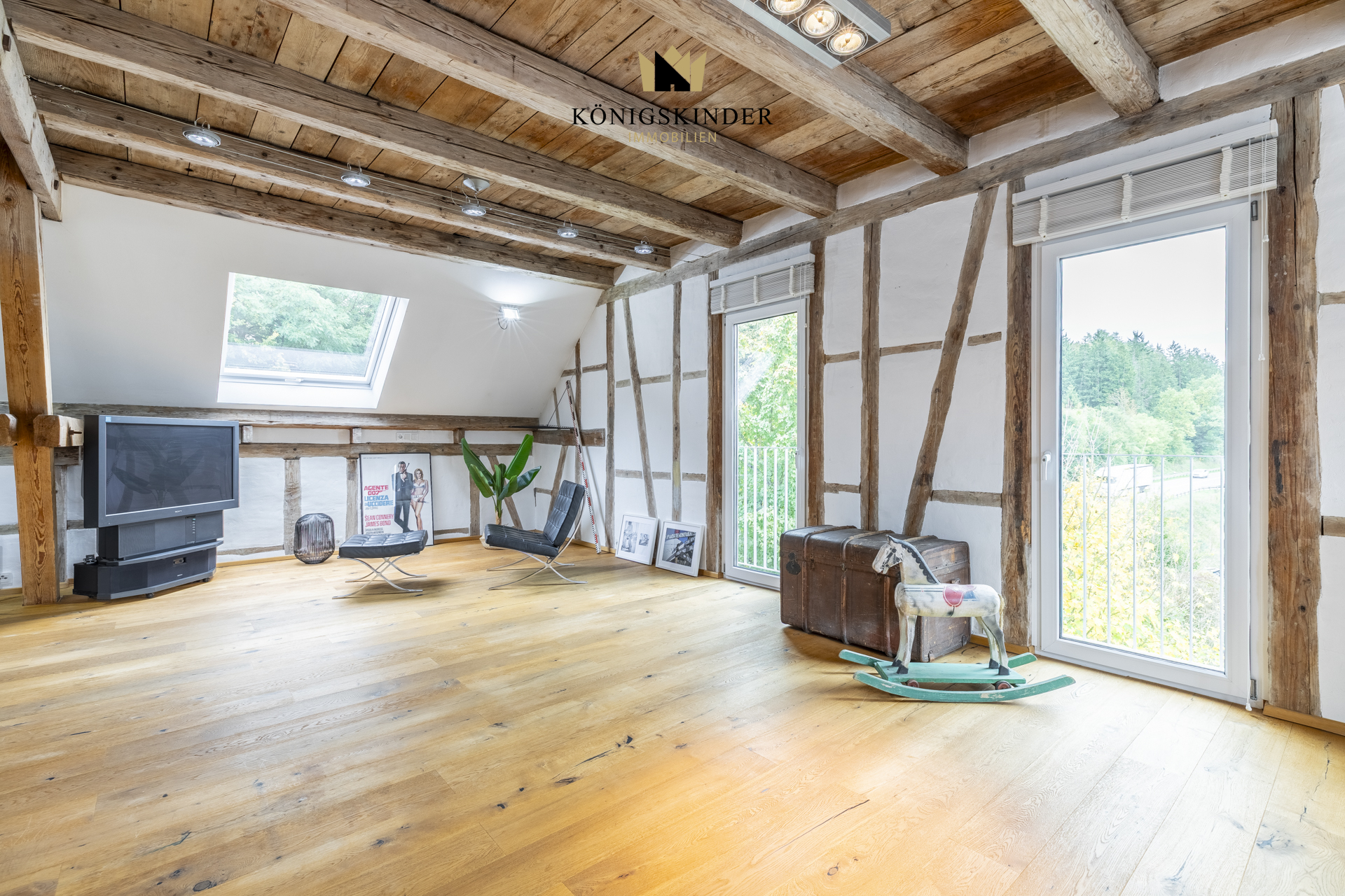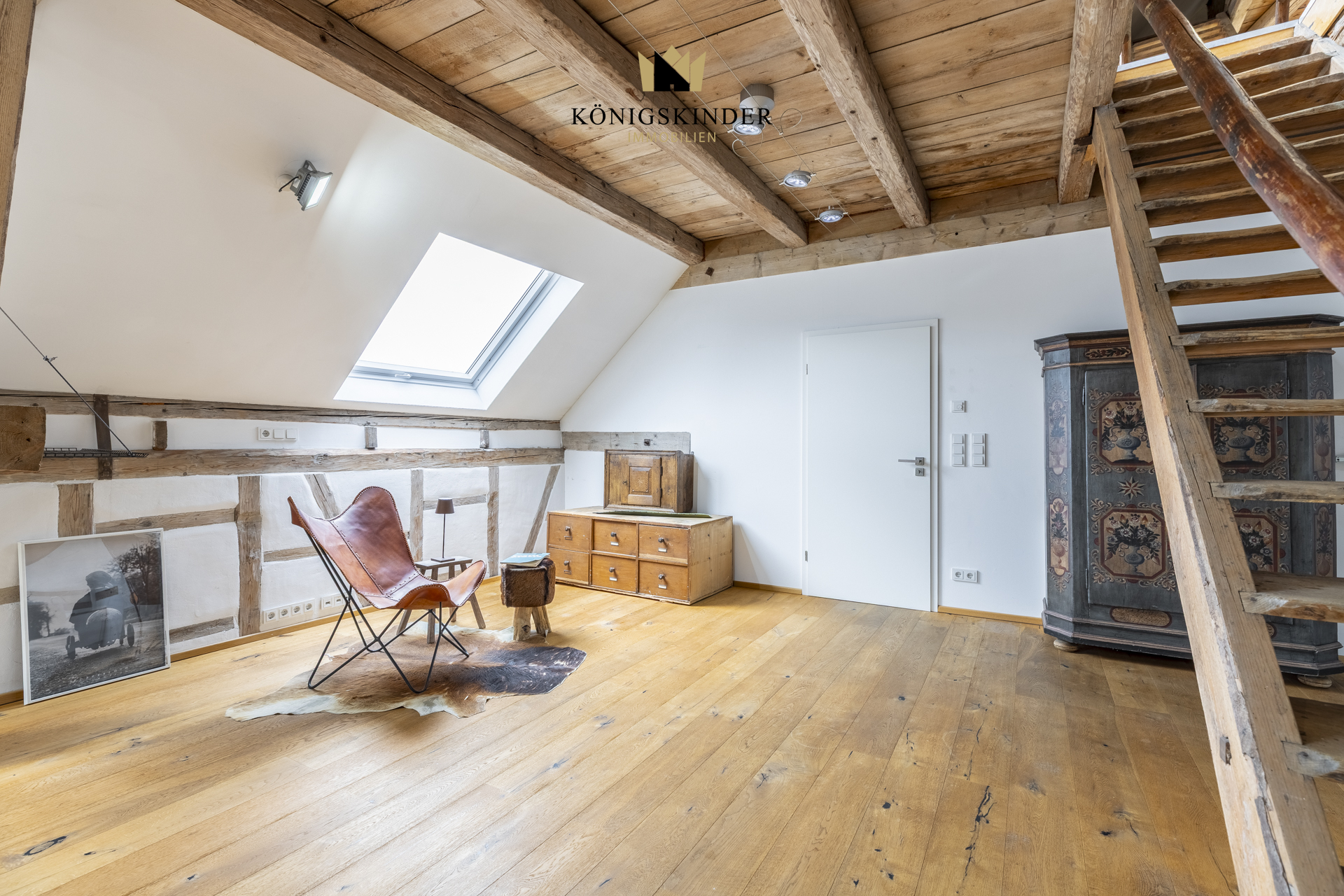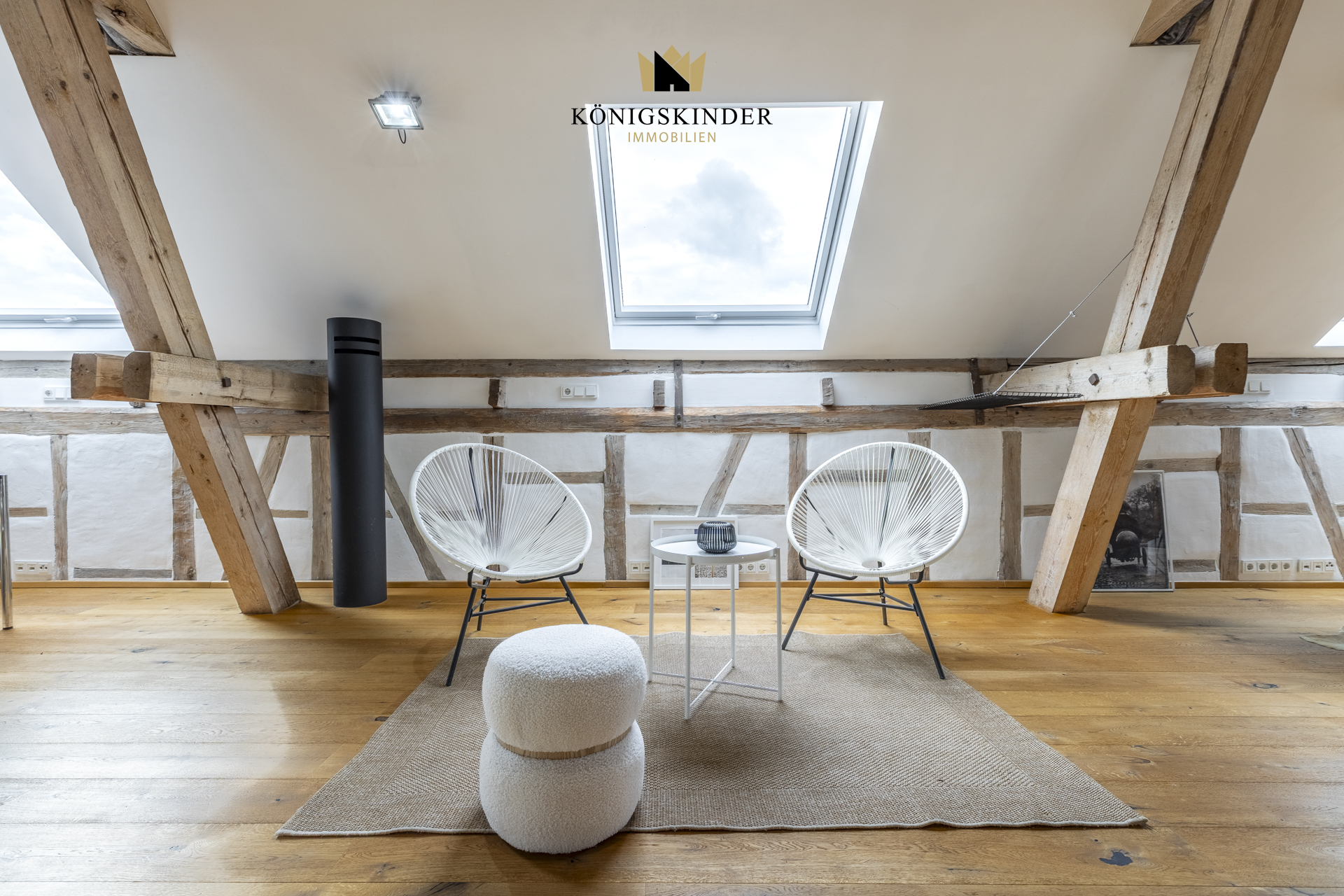 Die sichtbaren Holzbalken, der offene Schnitt und die großzügige Fläche schaffen ein Raumgefühl, das man nicht planen kann – es ist einfach da. Die moderne Küche fügt sich unaufdringlich ins Gesamtbild ein und bietet Platz für gemeinsames Kochen oder kurze Pausen im Arbeitsalltag.