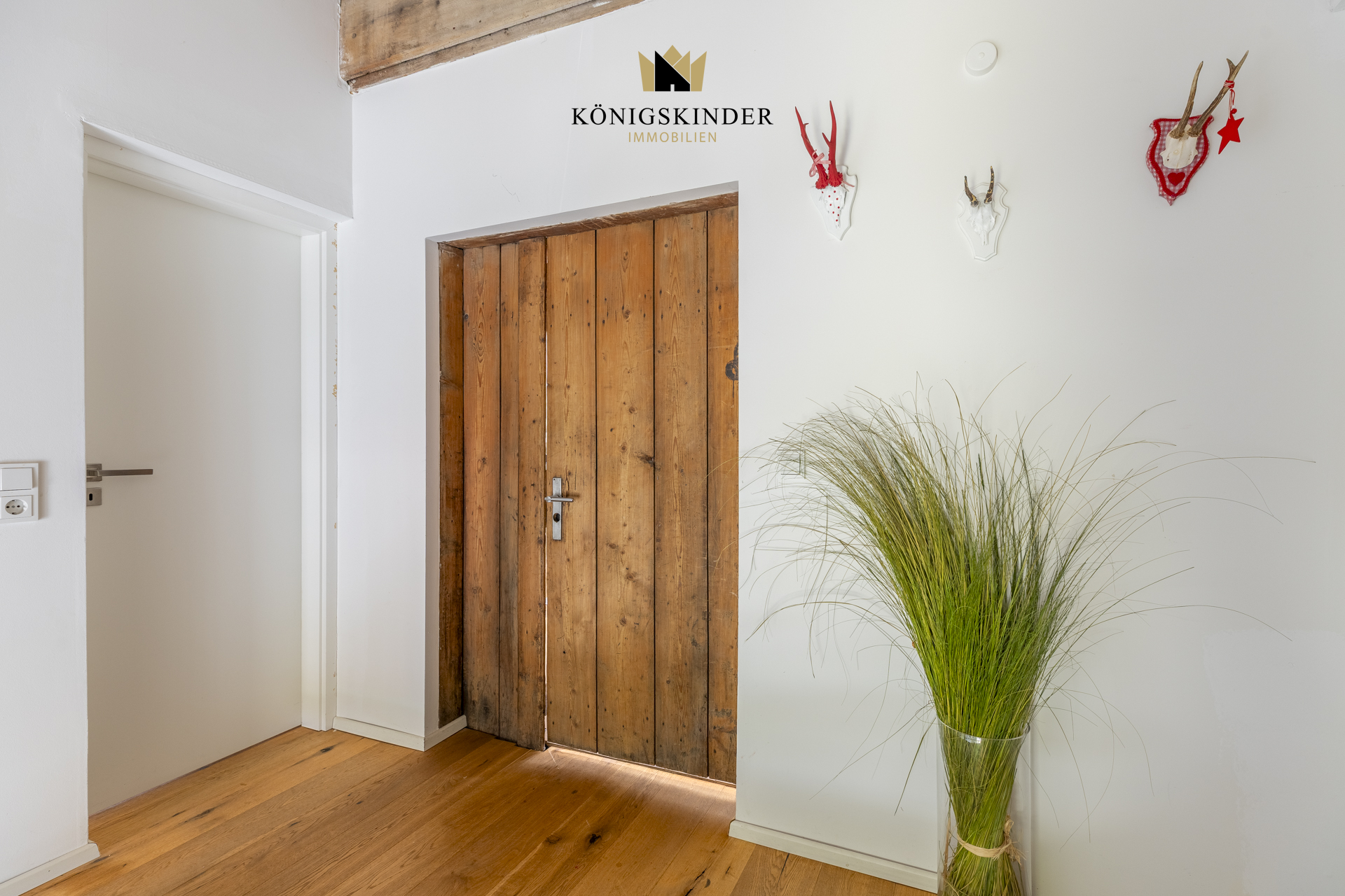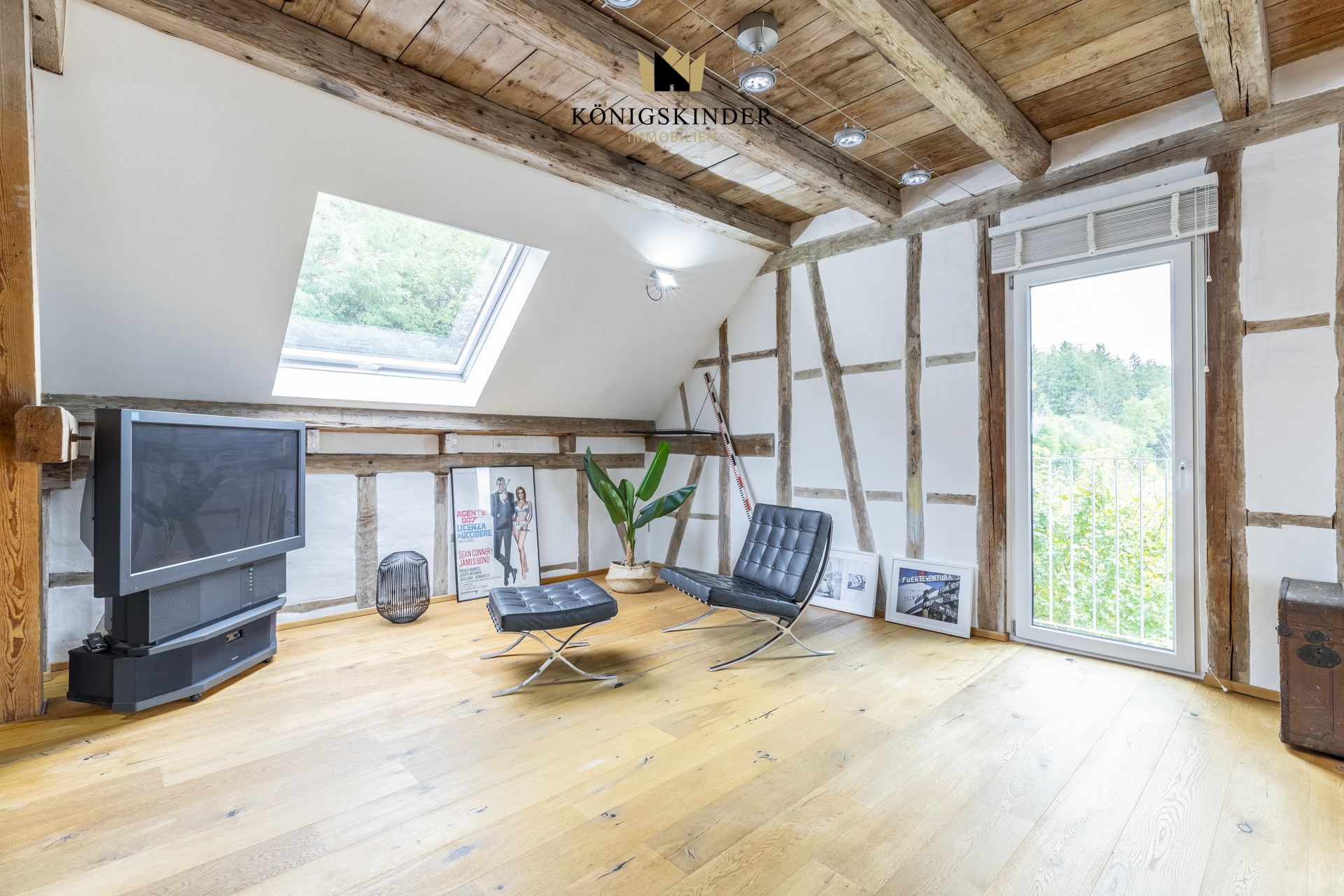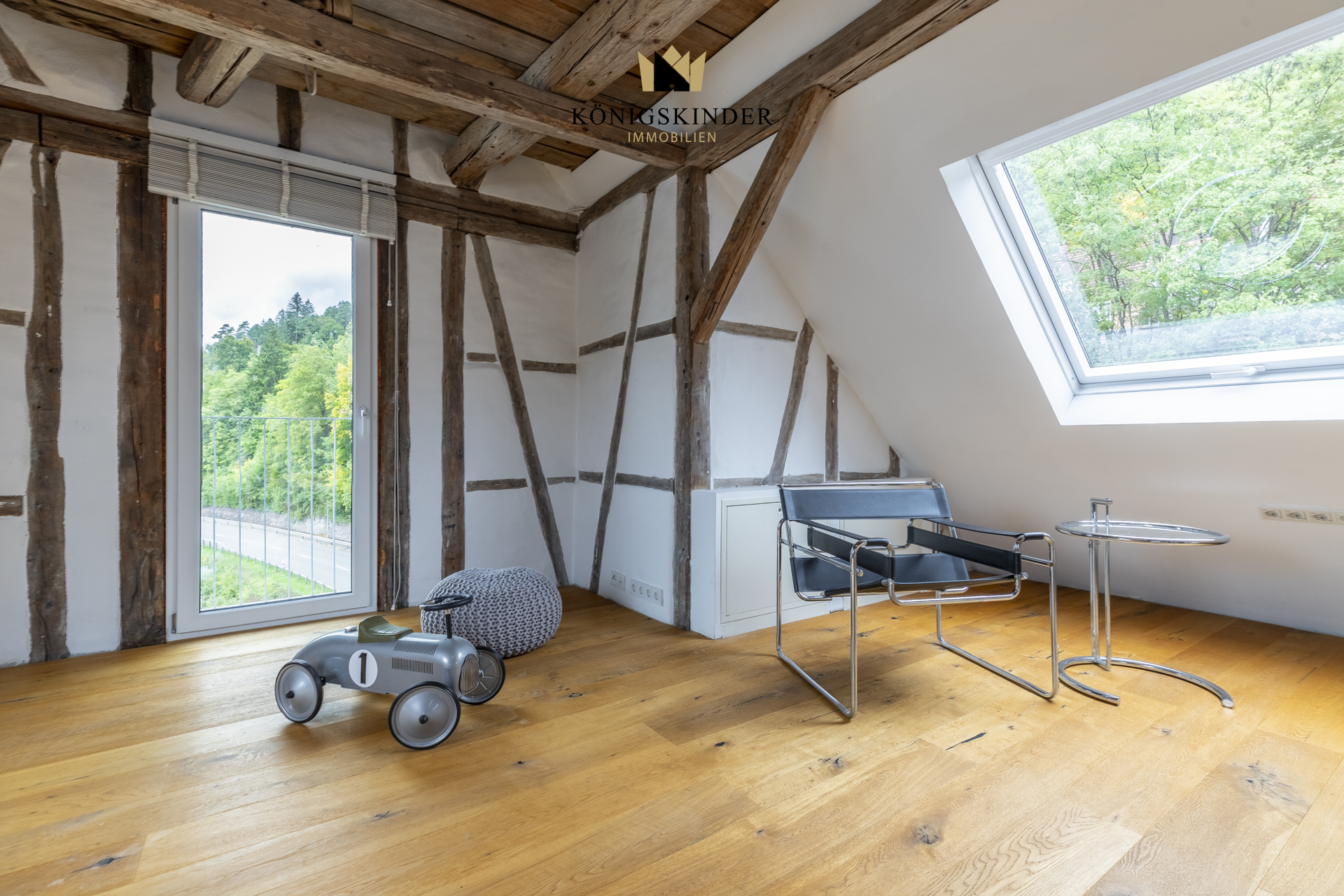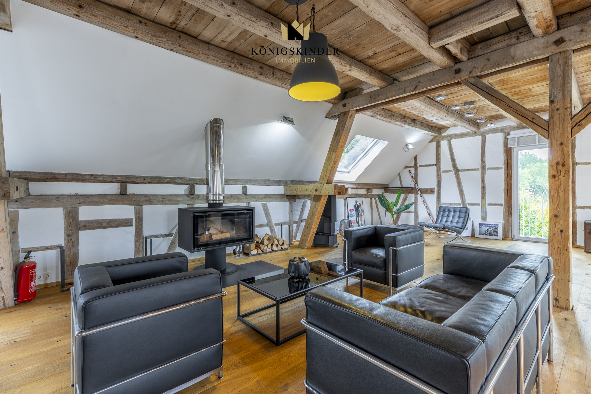 Die sichtbaren Holzbalken, der offene Schnitt und die großzügige Fläche schaffen ein Raumgefühl, das man nicht planen kann – es ist einfach da. Die moderne Küche fügt sich unaufdringlich ins Gesamtbild ein und bietet Platz für gemeinsames Kochen oder kurze Pausen im Arbeitsalltag.