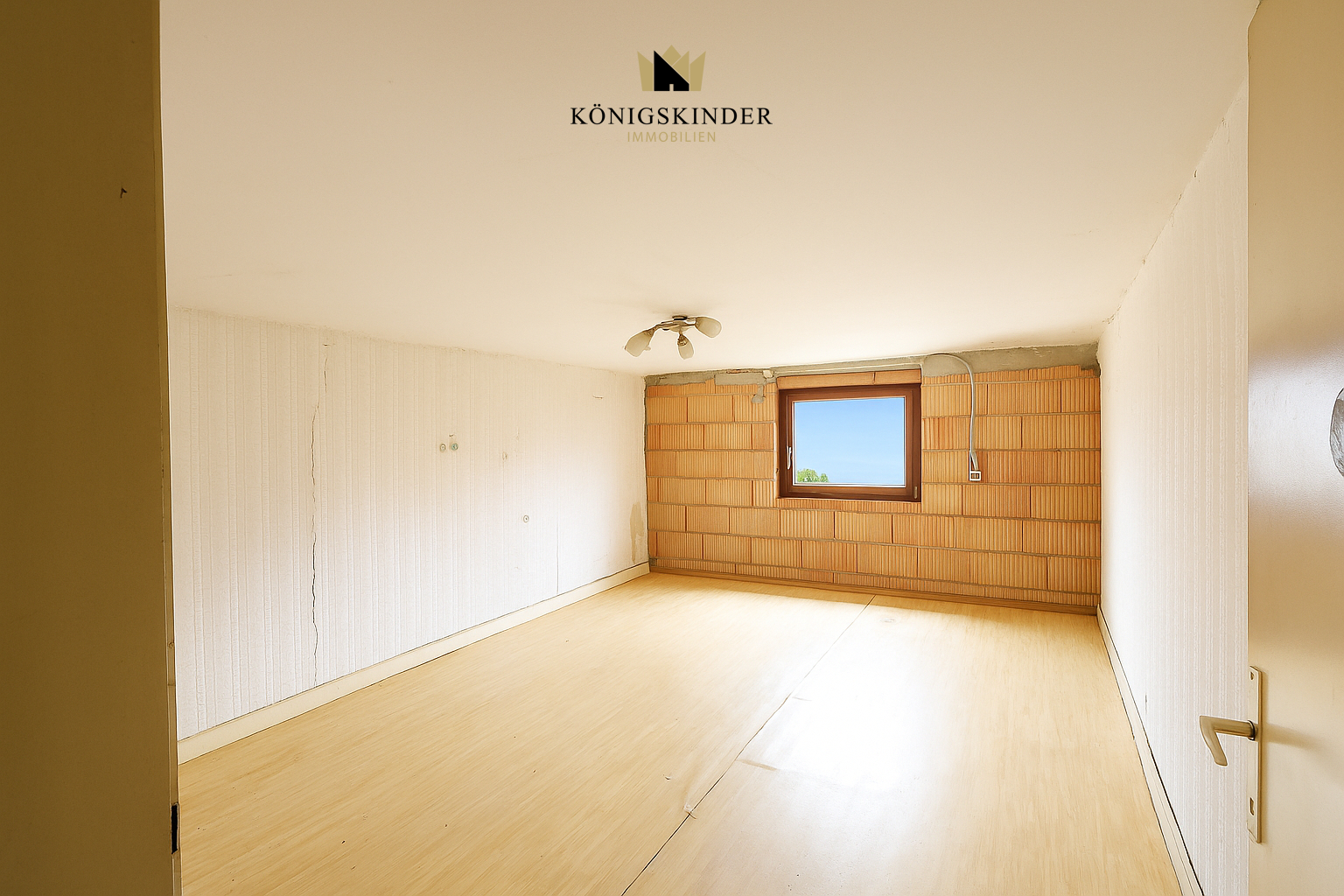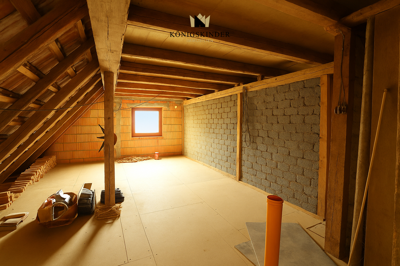Darüber in der ersten Dachgeschoss-Ebene mit ca. 60 m² Nutzfläche wurde ein Zimmer provisorisch eingebaut; der restliche Dachraum eignet sich zum weiteren Ausbau einer Maisonette-Wohnung bis zur Dachspitze.