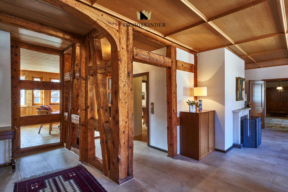Die tragenden Balken wurden freigelegt und prägen die Wohnatmosphäre, die man als elegant-rustikal bezeichnen kann. Dadurch gewonnene Einblicke und Durchblicke verschaffen der Wohnung eine eigene Kultiviertheit.