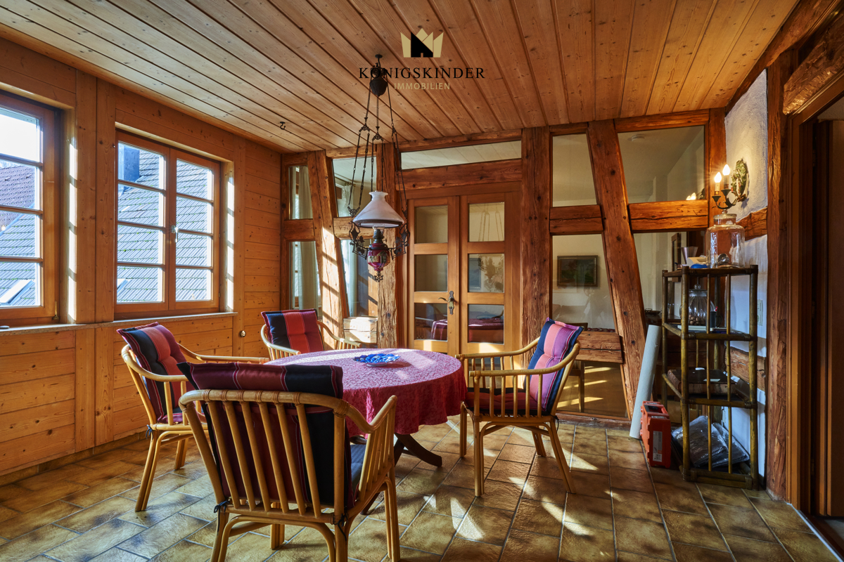 Eine Besonderheit ist ein Raum, den ich hinsichtlich seiner Nutzung entweder als "Sommerzimmer" oder "Wintergarten" bezeichnet habe. Es ist ein neu ausgebauter Wohnraum mit zahlreichen Fenstern, die sich im Sommer aushängen lassen - es entsteht quasi eine Loggia. Und im Winter ist es einem Wintergarten vergleichbar - nach Westen gelegen haben Sie dort immer Sonne bis zum Abend (natürlich nur, wenn sie scheint...). Durch die tragenden Balken, ausgefacht mit Glas und einer Tür haben Blick und Zugang vom Schlafzimmer.